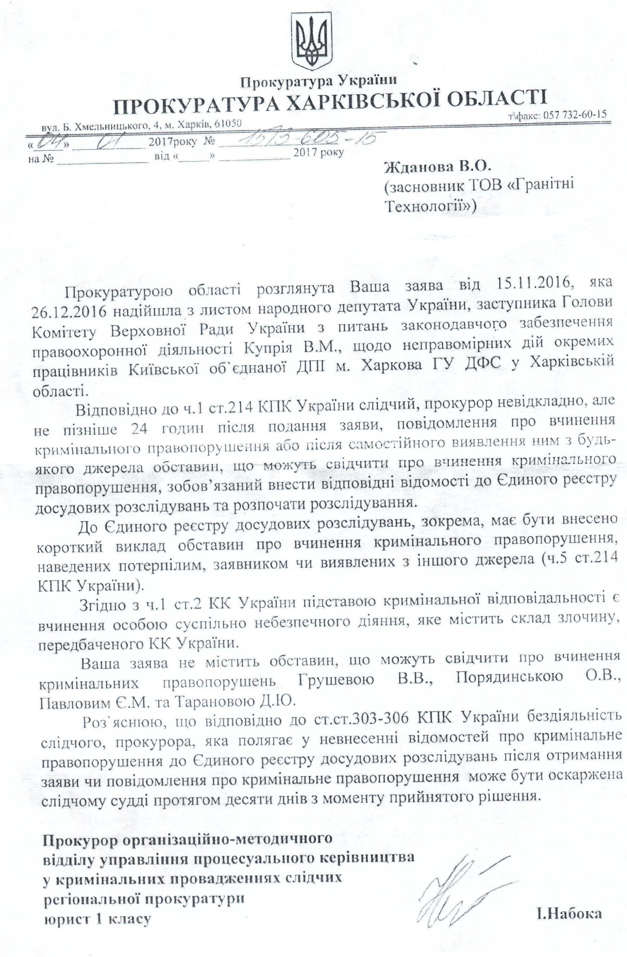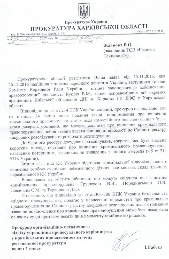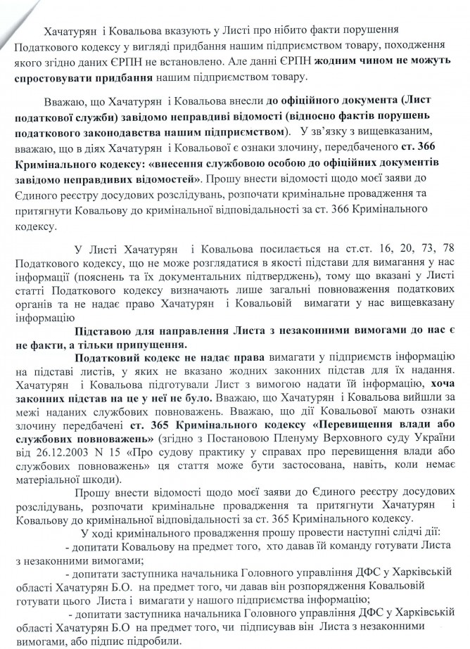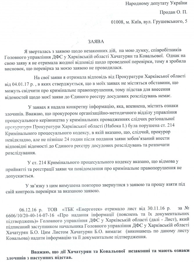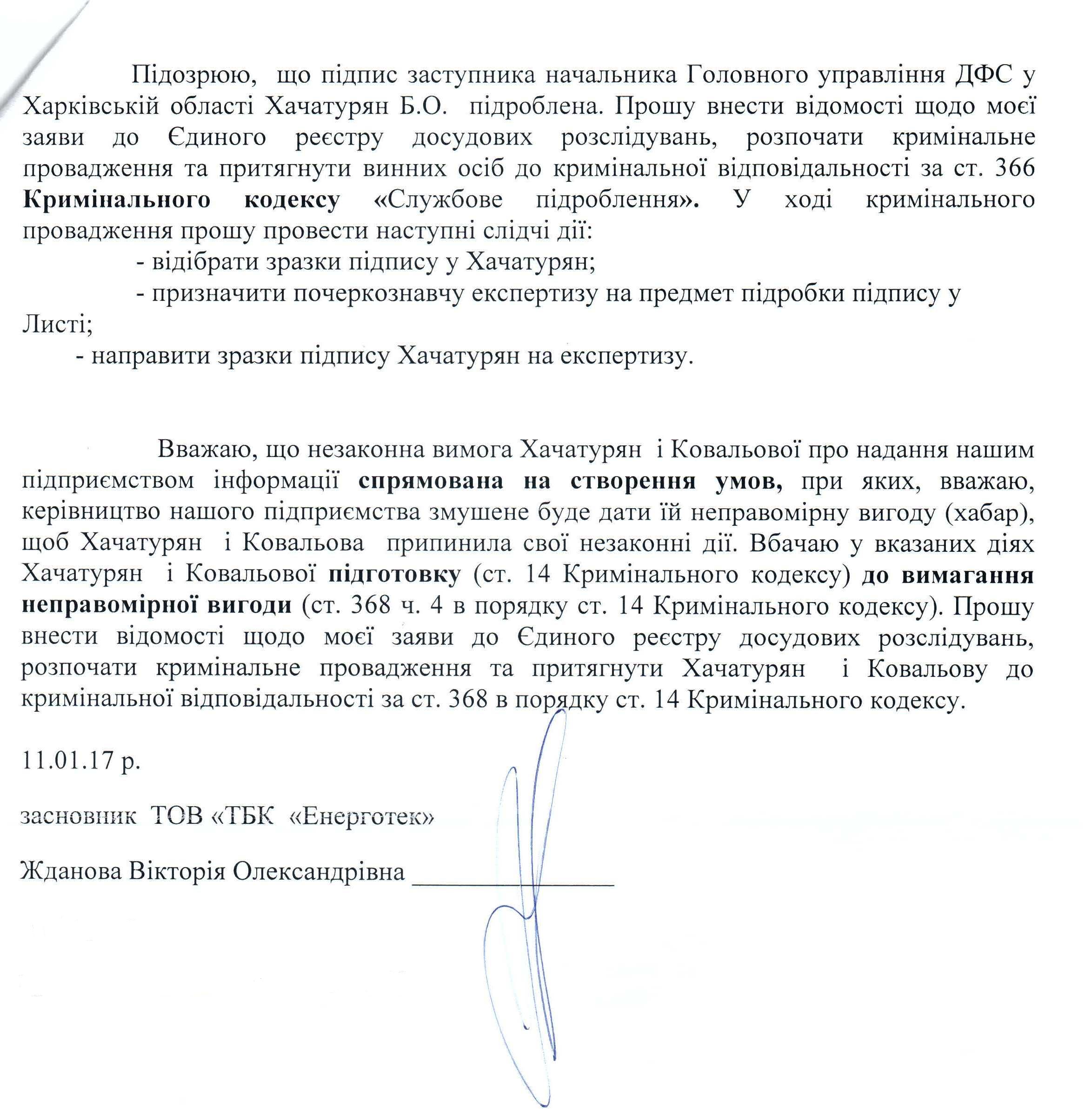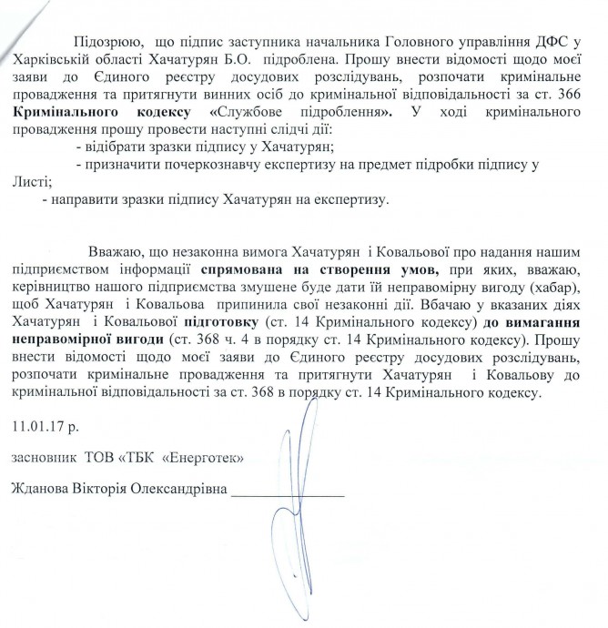 Звернення засновника ТОВ “ТБК “Енерготек” Жданової В.О. щодо внесення до ЄРДР заяви про порушення законодавства співробітниками ГУ ДФС у Харківській області