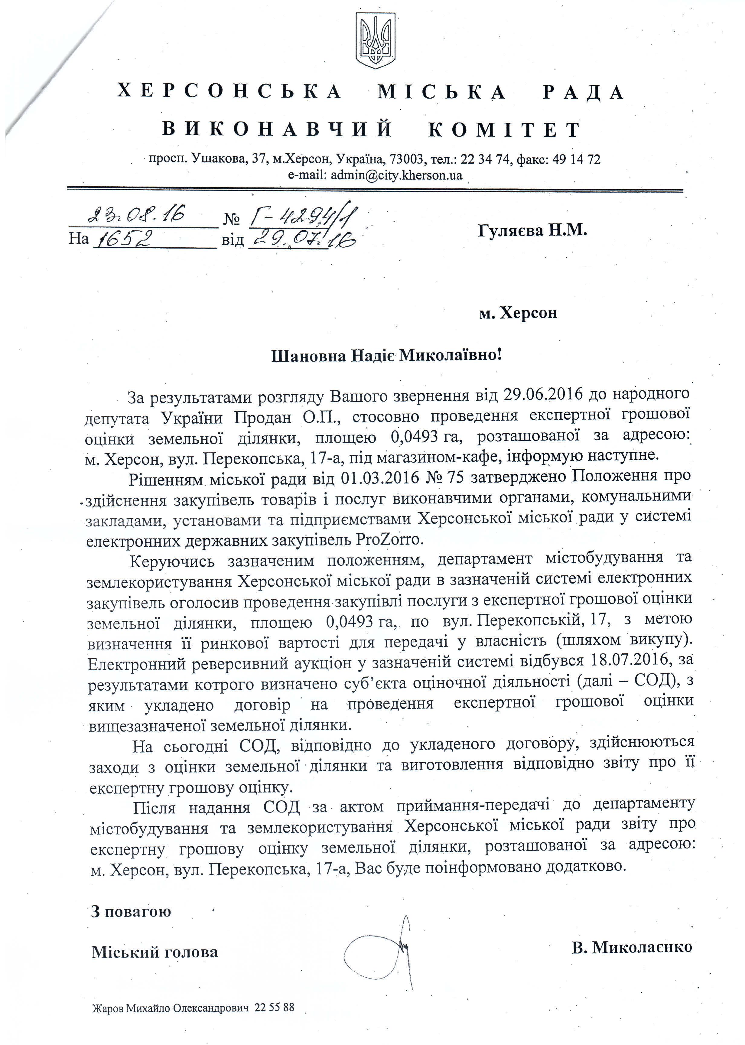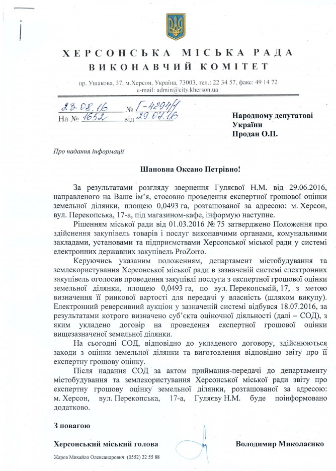 Вхідна документація > Відповідь Виконавчого комітету Херсонської міської ради на депутатське звернення щодо проведення експертної грошової оцінки земельної ділянки Департаментом містобудування та землекористування виконавчого комітету Херсонської міської ради