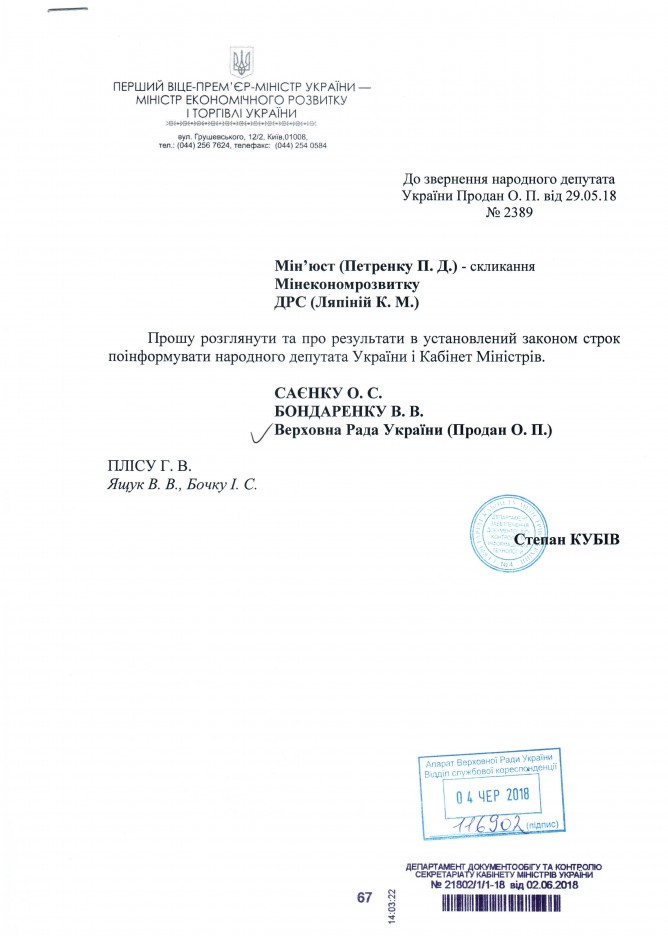 Вхідна документація > Доручення Першого віце-прем’єр-міністра України – Міністра економічного розвитку і торгівлі України С. І. Кубіва до депутатського звернення щодо реалізації Рекомендацій парламентських слухань на тему: «Розвиток підприємництва в Україні та підтримка малого і середнього бізнесу» і відповідних положень законів України