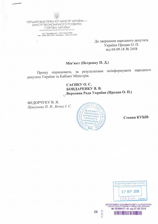 Доручення Першого віце-прем’єр-міністра України – Міністра економічного розвитку і торгівлі України С.Кубіва до депутатського звернення щодо законопроектів №4650 та №6450, якими пропонується скасування дії актів СРСР на території України