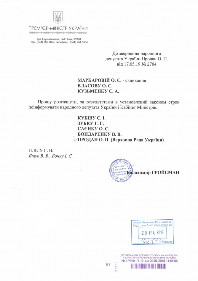 Доручення Прем’єр-міністра України Гройсмана В.Б. до депутатського звернення щодо сплати до місцевих бюджетів податку на доходи фізичних осіб