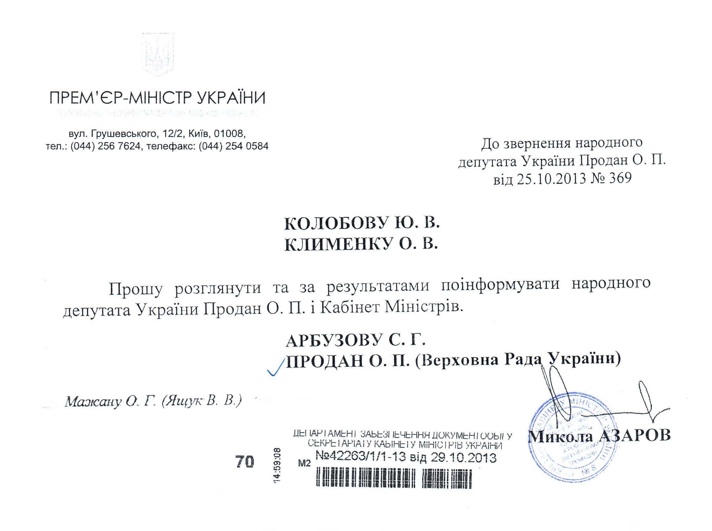 Доручення Прем’єр-міністра України М. Азарова про розгляд депутатського звернення щодо проекту Закону України «Про Державний бюджет України на 2014 рік»
