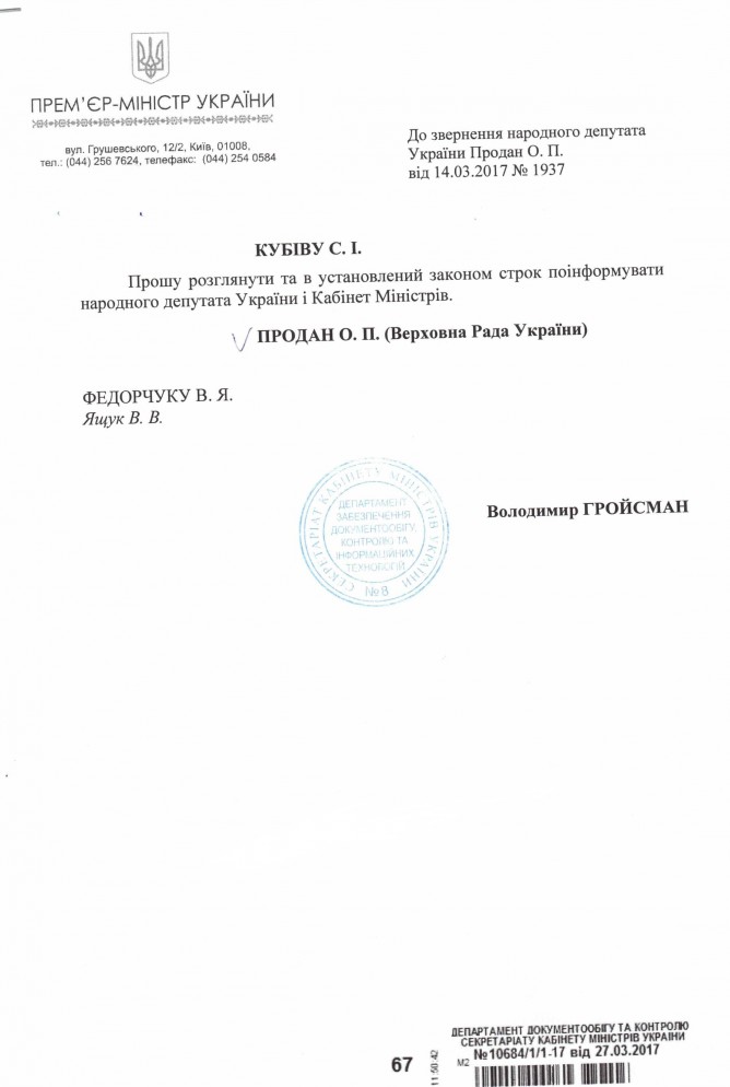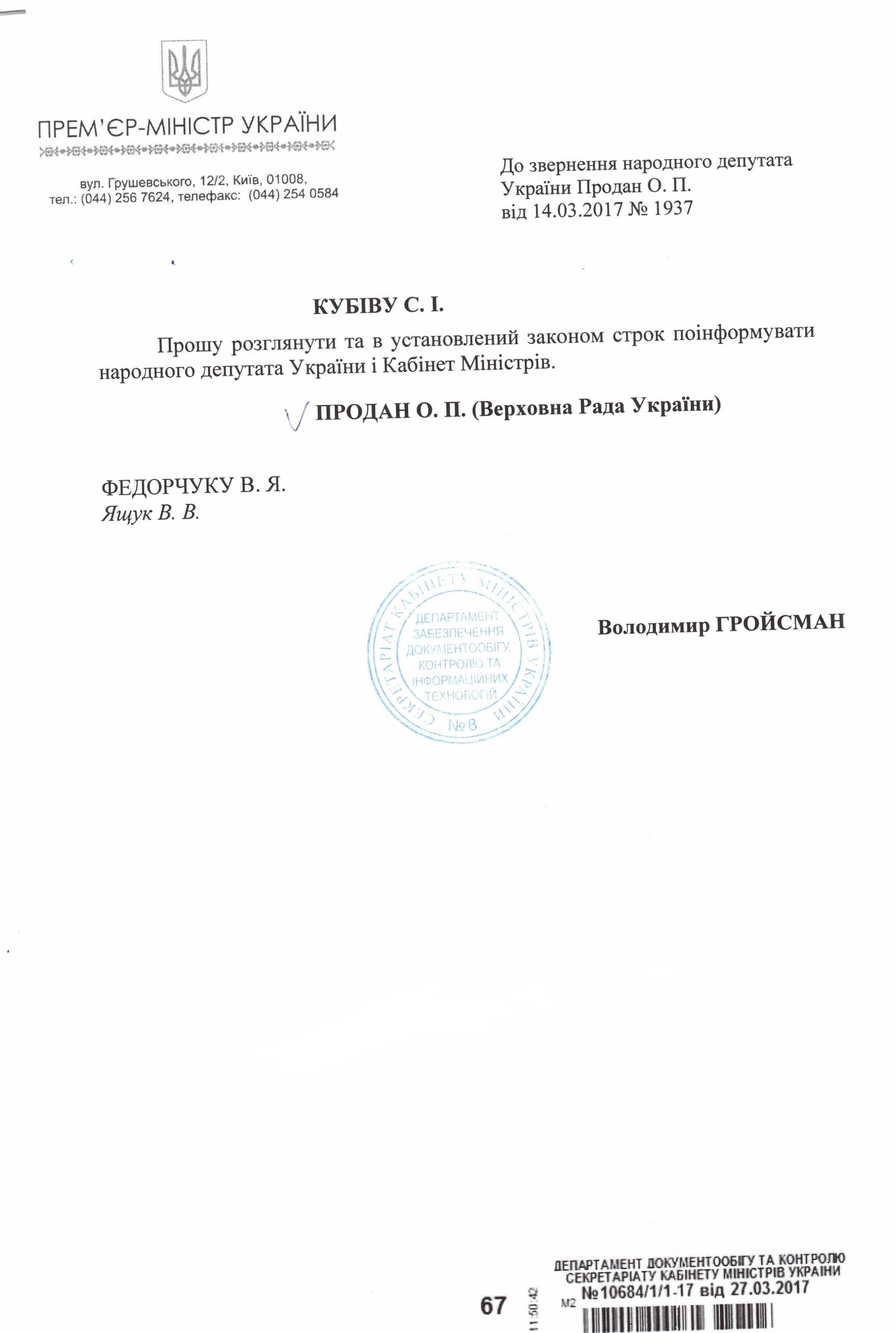 Доручення Прем’єр-міністра України В.Б. Гройсмана до депутатського звернення щодо затвердження Переліку груп технічно складних побутових товарів з метою застосування РРО платниками єдиного податку