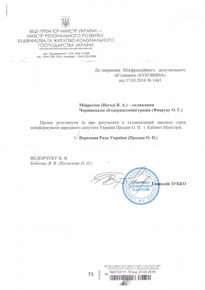 Вхідна документація > Доручення Віце-прем’єр-міністра – Міністра регіонального розвитку, будівництва та ЖКГ України Г.Г. Зубка до депутатського звернення членів МФО “Буковина” щодо будівництва загальноосвітніх та дошкільних навчальних закладів у Глибоцькому районі Чернівецької області