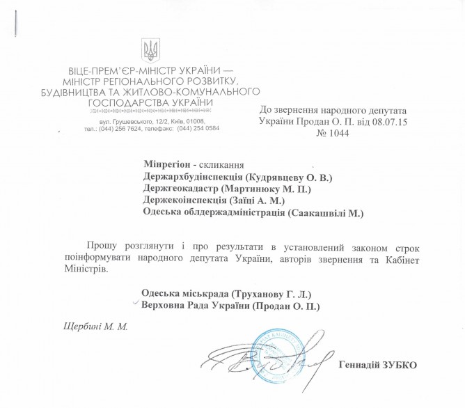 Вхідна документація > Доручення Віце-прем’єр-міністра України- Міністра регіонального розвитку, будівництва та ЖКГ України Г.Г. Зубка про розгляд депутатського звернення щодо збереження рекреаційної зони на території санаторію “Фонтан”