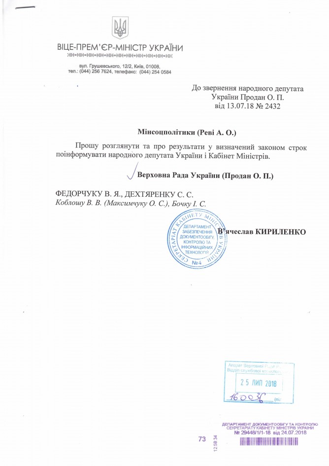 Головна > Верховна Рада України > Вхідна документація > Доручення Віце-прем’єр-міністра України В. Кириленка до депутатського звернення щодо порушення статті 19 Конституції України при проведенні перевірок додержання трудового законодавства
