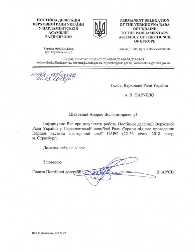 Голова української делегації В.Ар’єв привітав М.Ніколетті з обранням на посаду Президента та висловив сподівання, що він буде Президентом, який не дозволить зменшення влади та авторитету Асамблеї. В.Ар’єв також акцентував увагу на тому, що ідея створення спеціального ad hoc комітету полягає в гармонізації правил двох гілок влади: законодавчої та виконавчої. На його думку це стане дуже цікавим прецедентом для майбутнього, оскільки він не чув про жодну державу, де парламент і уряд мають однакові правила та процедури. Голова української делегації наголосив, що: «ми перебуваємо у дивній позиції: 1) ми всі розуміємо, що створюється спеціальний комітет для зміни правил та процедур, оскільки Російська Федерація має повернутися до Асамблеї та сплатити борг перед Радою Європи – це свого роду шантаж і схоже на те, що ми змінюємо кримінальний кодекс, щоб зробити злочинця не винним;  2) якщо ми змінюємо правила, вилучаючи можливість оскарження будь-яких повноважень національної делегації Російської Федерації – ми вбиваємо процедуру моніторингу, тим самим послаблюючи силу Асамблеї та наші повноваження як Парламентської асамблеї. Це означає, що будь-яке порушення, яке не буде відповідати правилам Асамблеї, не буде оскаржено, як це було раніше. І саме тому, ми повинні дуже серйозно подумати про це питання».
