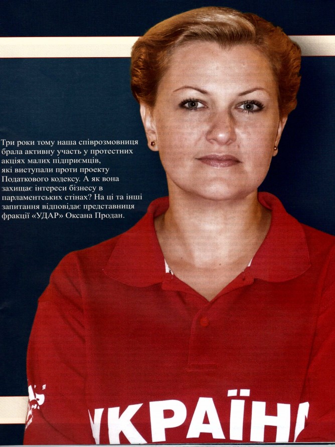 ОКСАНА ПРОДАН: Я була одним із ініціаторів та організаторів акцій протесту проти Податкового кодексу України, а також співавтором законопроекту про спрощену систему оподаткування (яка діє з 2012 року). Тоді нам, лідерам підприємницьких організацій, було складніше працювати, бо доводилося звертатися по допомогу до депутатів, переконувати їх у необхідності підтримки позиції малого та середнього бізнесу. Зараз дещо легше. Хоча я – єдиний представник малого та середнього бізнесу у Верховній Раді. Продовжую працювати у Всеукраїнському об’єднанні підприємців малого та середнього бізнесу «Фортеця» (до складу якого входить понад 50 об’єднань підприємців із різних регіонів і галузей). Я та мої колеги з фракції «УДАР» уже внесли комплекс законопроектів, спрямованих на спрощення умов ведення бізнесу, на створення можливостей саме для малого та середнього бізнесу.