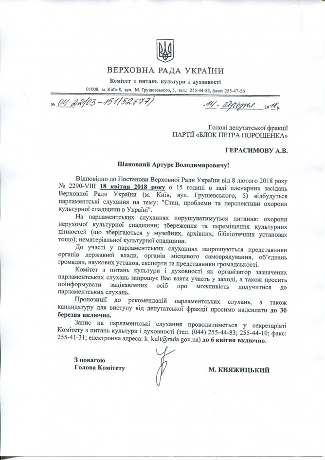 22Бер Коментування вимкнено Комітет ВРУ з питань культури і духовності про проведення парламентських слухань на тему “Стан, проблеми та перспективи охорони культурної спадщинив Україні”, 18 квітня 2018 року