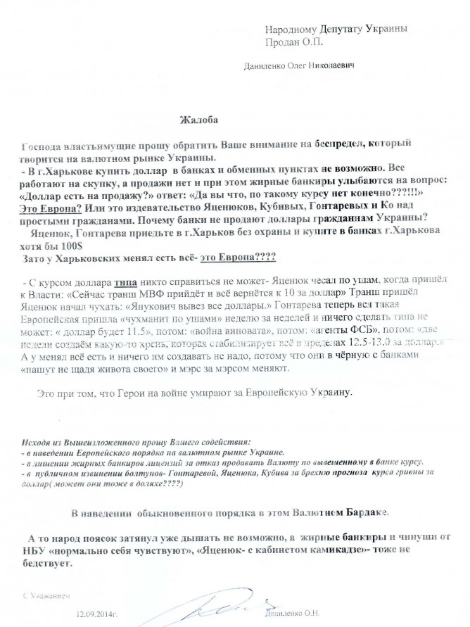30Вер Коментування вимкнено Лист Даниленка О.М. щодо необхідності врегулювання ситуації на валютному ринку