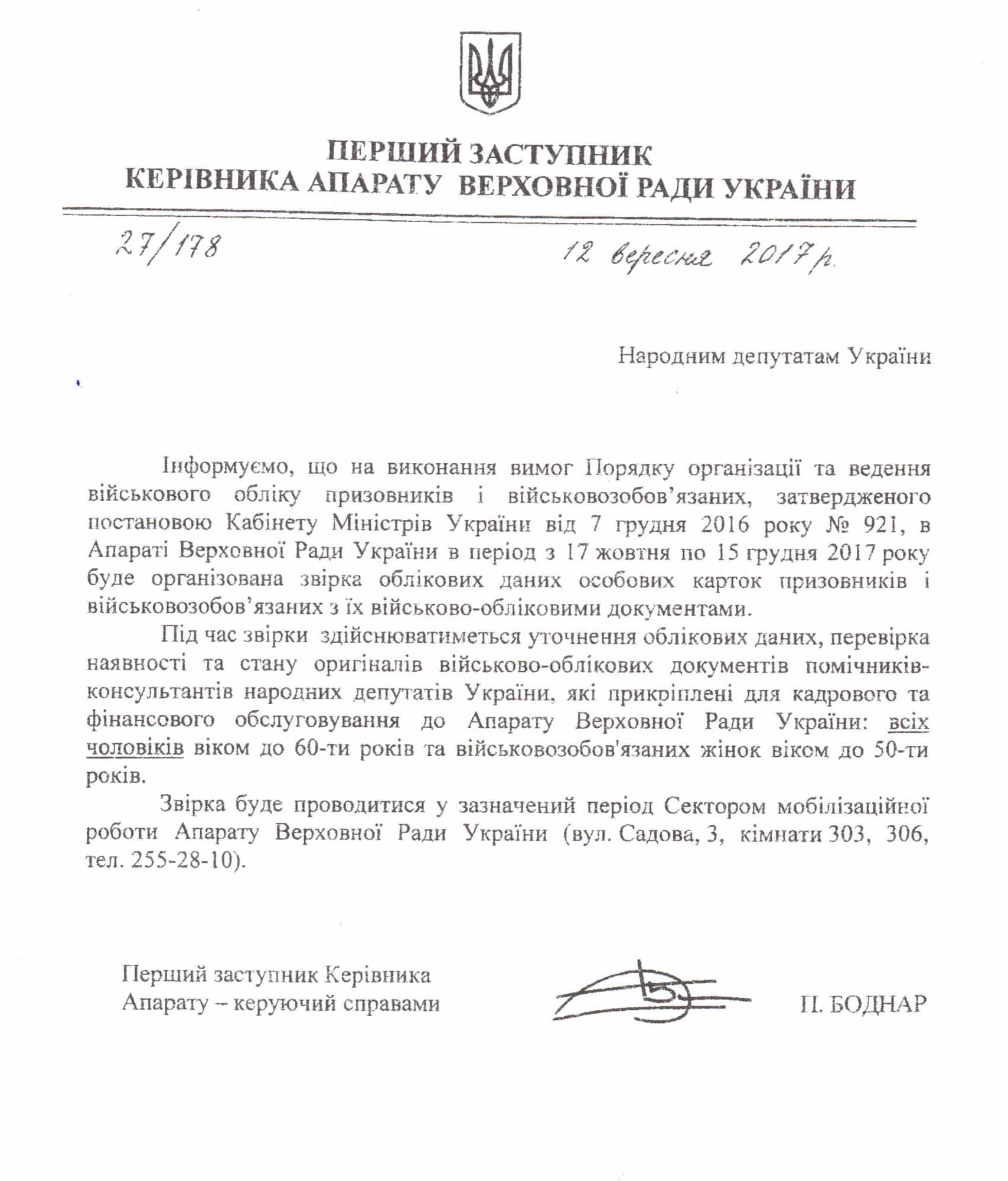 Лист Апарату Верховної Ради України щодо звірки облікових даних особових карток призовників і військовозобов’язаних з їх військово-обліковими документами