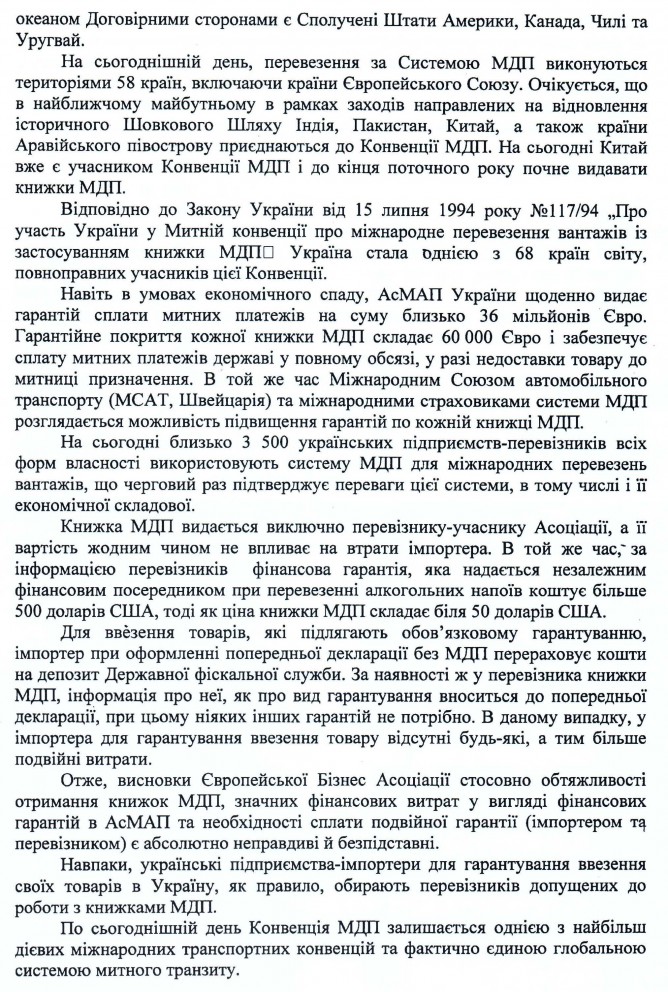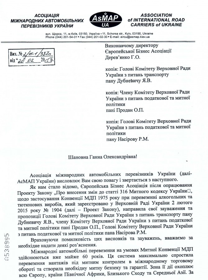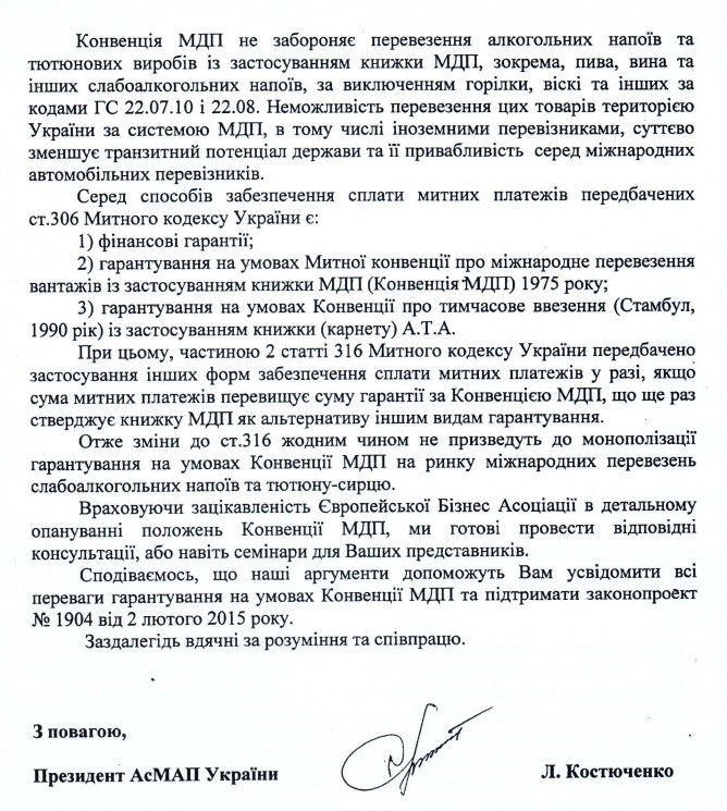 Вхідна документація > Лист АсМАП України щодо законопроекту “Про внесення змін до статті 316 МИтного кодексу України” (щодо застосування Конвенції МДП 1975 року при перевезенні алкогольних та тютюнових виробів), реєстр. №1904