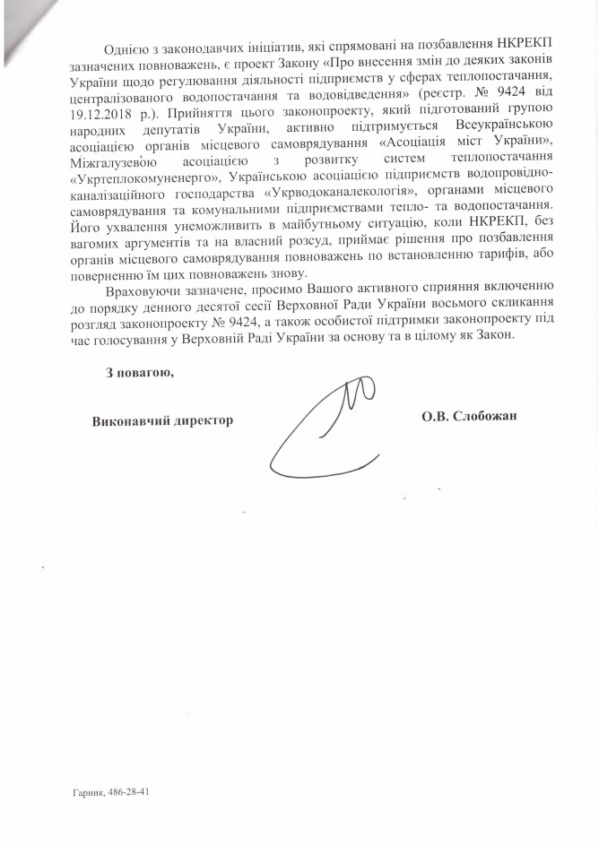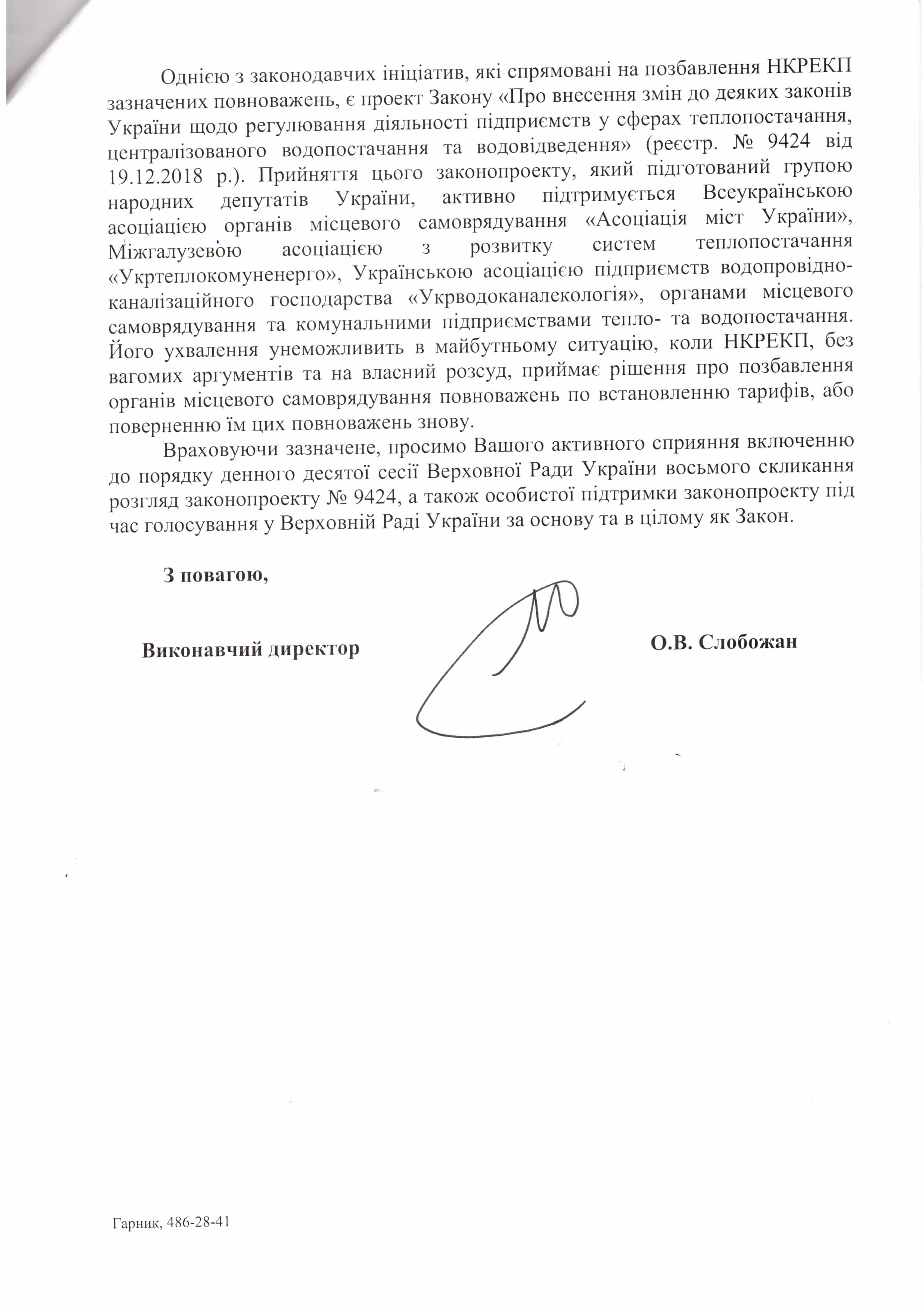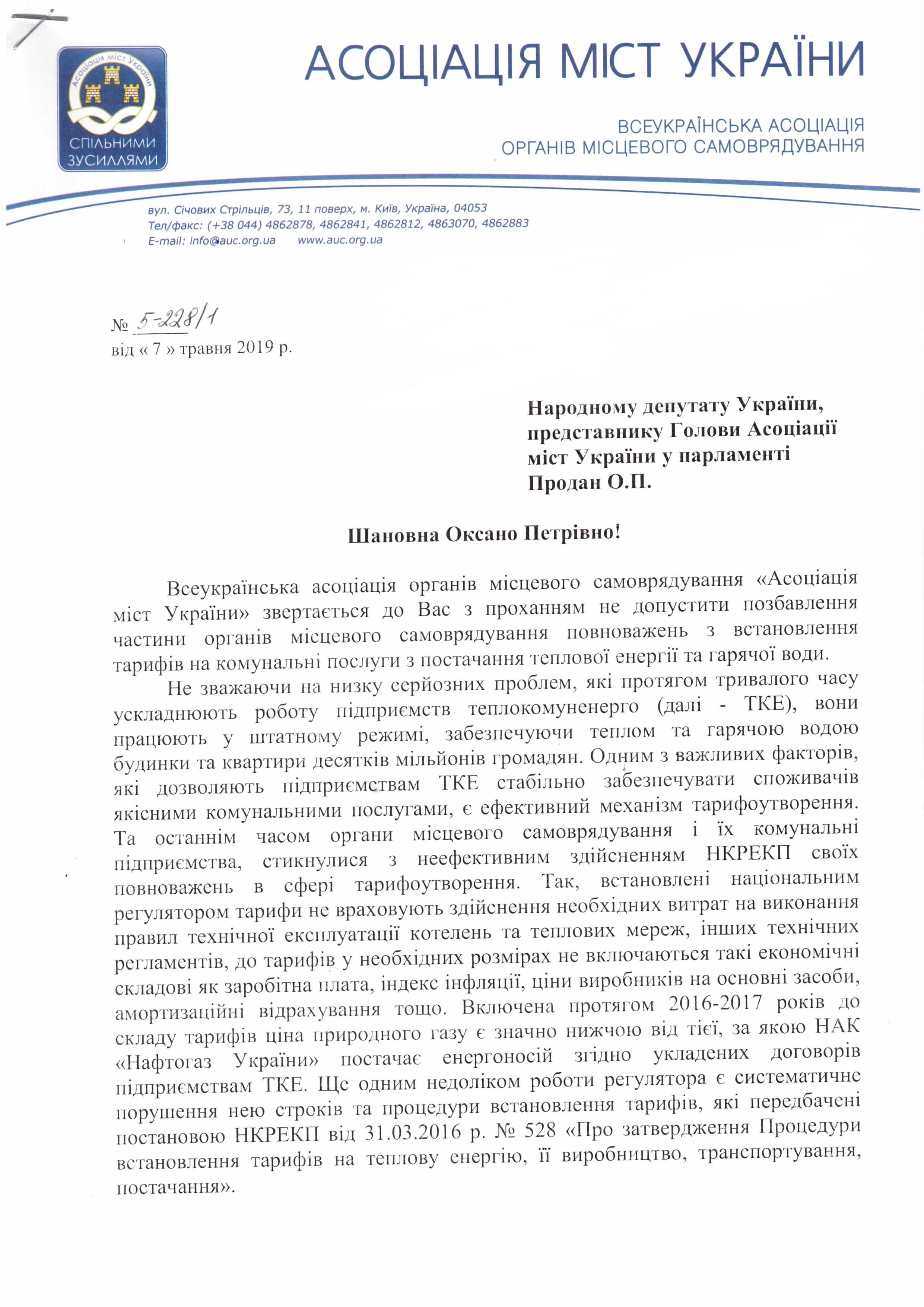 Вхідна документація > Лист Асоціації міст України щодо підтримки законопроекту “Про внесення змін до деяких законів України щодо регулювання діяльності підприємств у сферах теплопостачання, централізованого водопостачання та водовідведення”, реєстр. №9424
