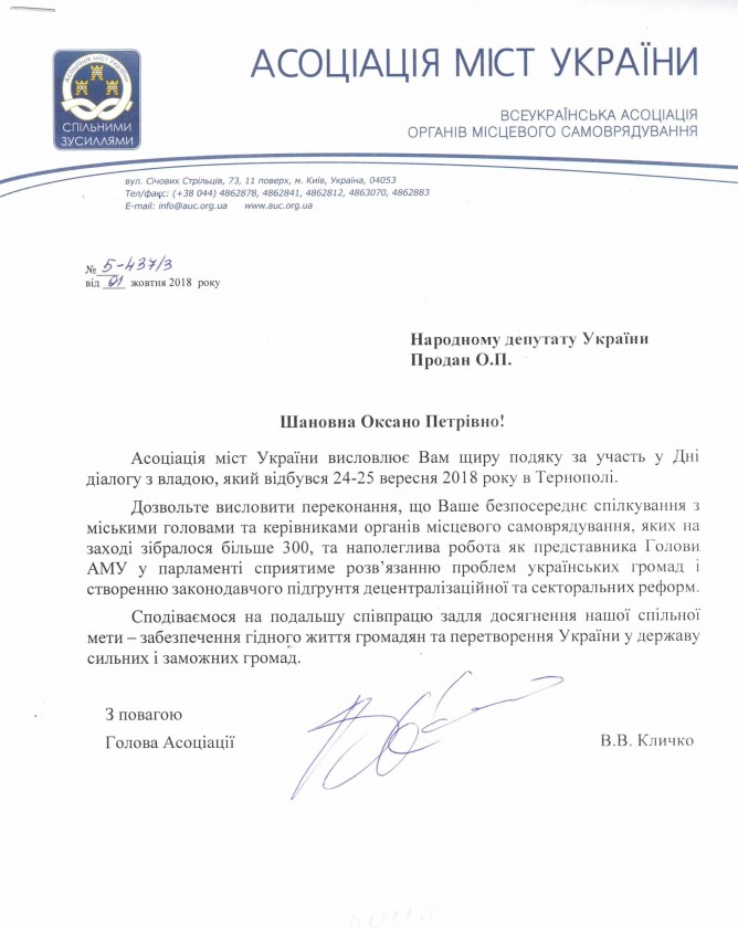 19Жов Коментування вимкнено Лист Асоціації міст України з подякою за участь у Дні діалогу з владою, що відбувся в м. Тернопіль