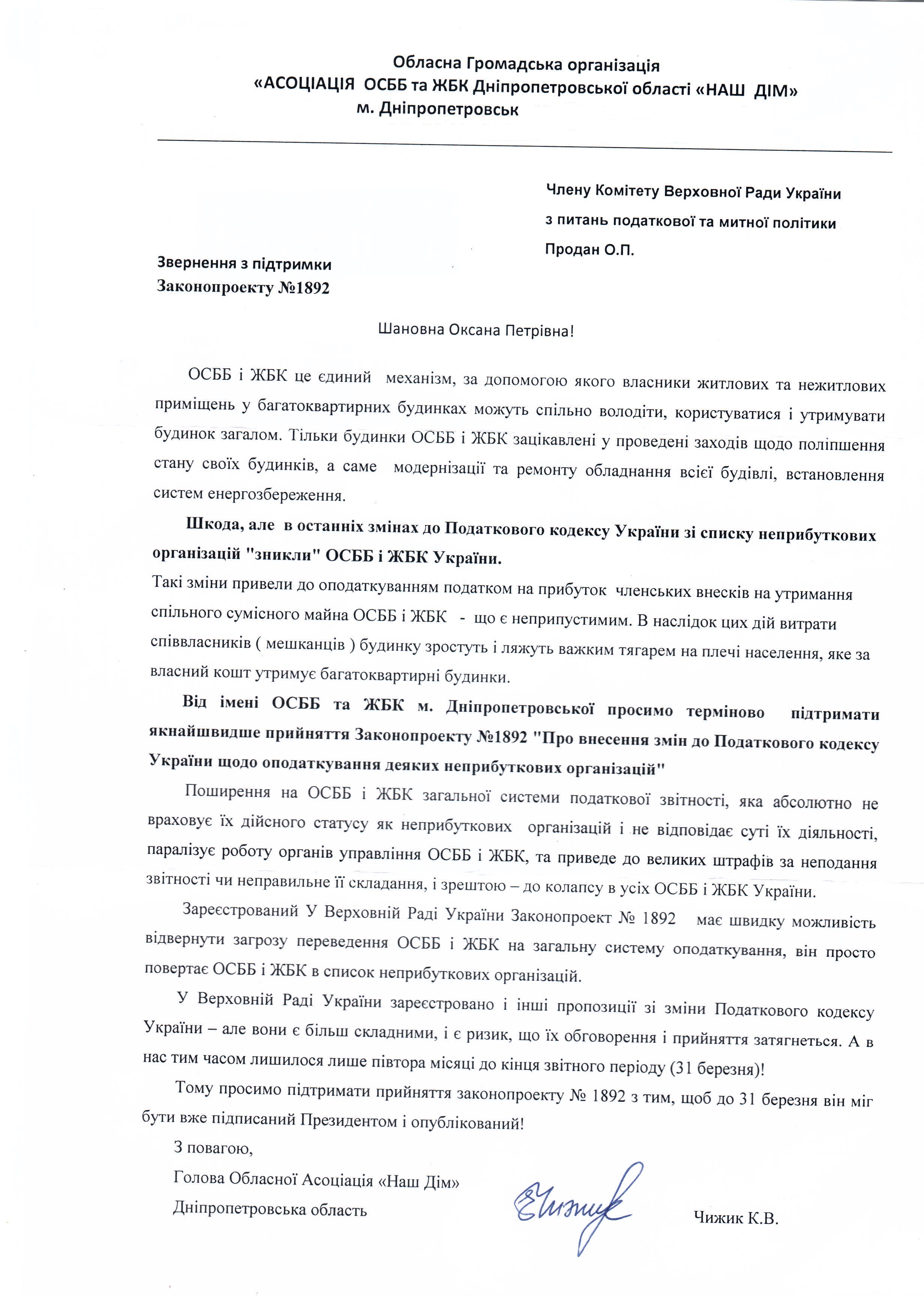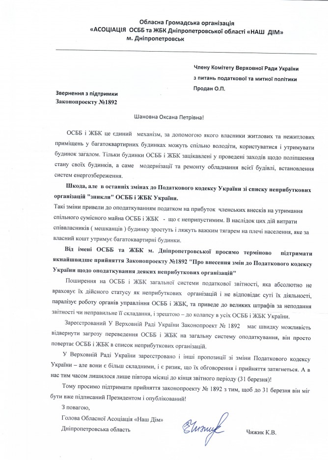 Лист Асоціації ОСББ та ЖБК Дніпропетровської області “Наш дім″ щодо підтримки законопроекту “Про внесення змін до Податкового кодексу України щодо оподаткування деяких неприбуткових організацій”, реєстр. №1892