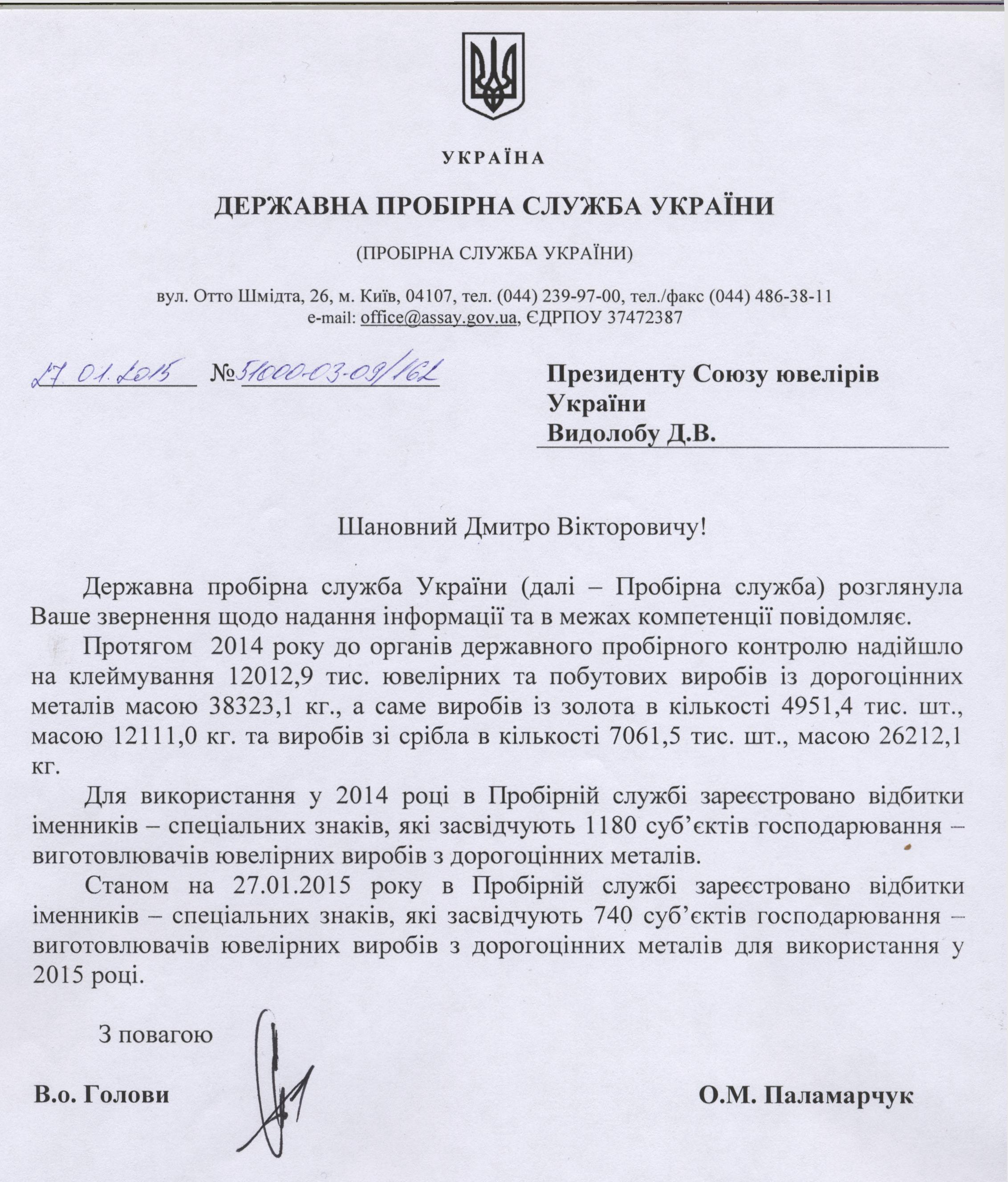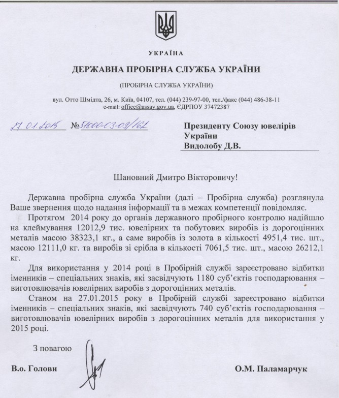 Направляємо для ознайомлення інформацію Державної пробірної служби України щодо обсягів ювелірного виробництва у 2014 р. та кількості суб`єктів господарювання – виготовлювачів ювелірних виробів у 2014 та 2015 роках.