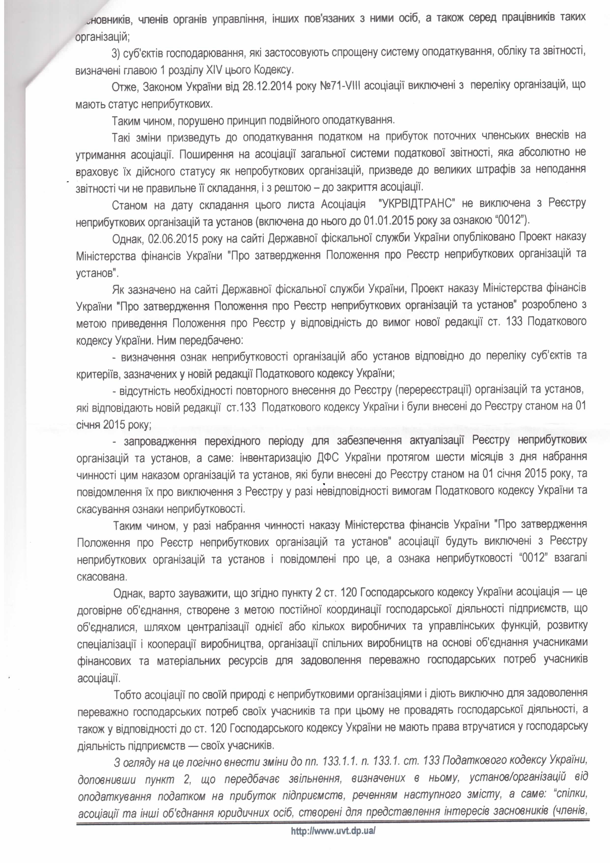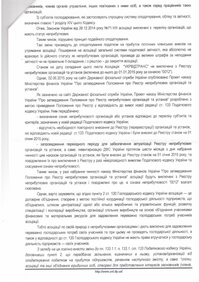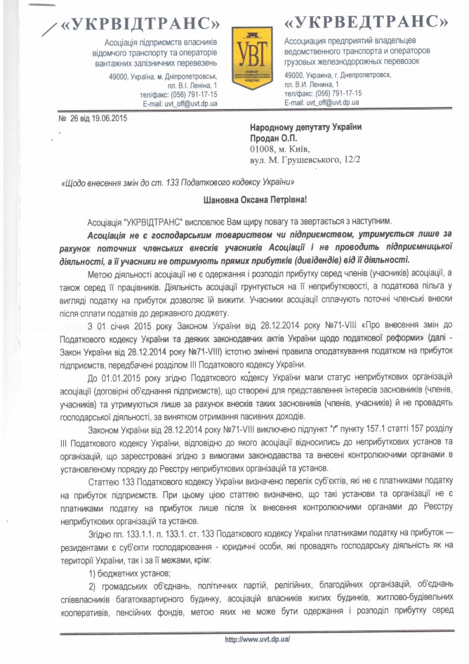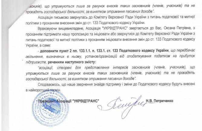 09Лип Коментування вимкнено Лист Асоціації “УКРВІДТРАНС” щодо внесення змін до Податкового кодексу України в частині віднесення асоціацій до неприбуткових організацій