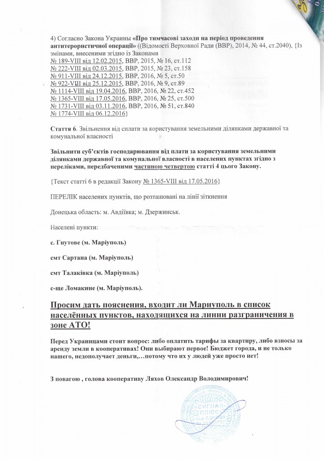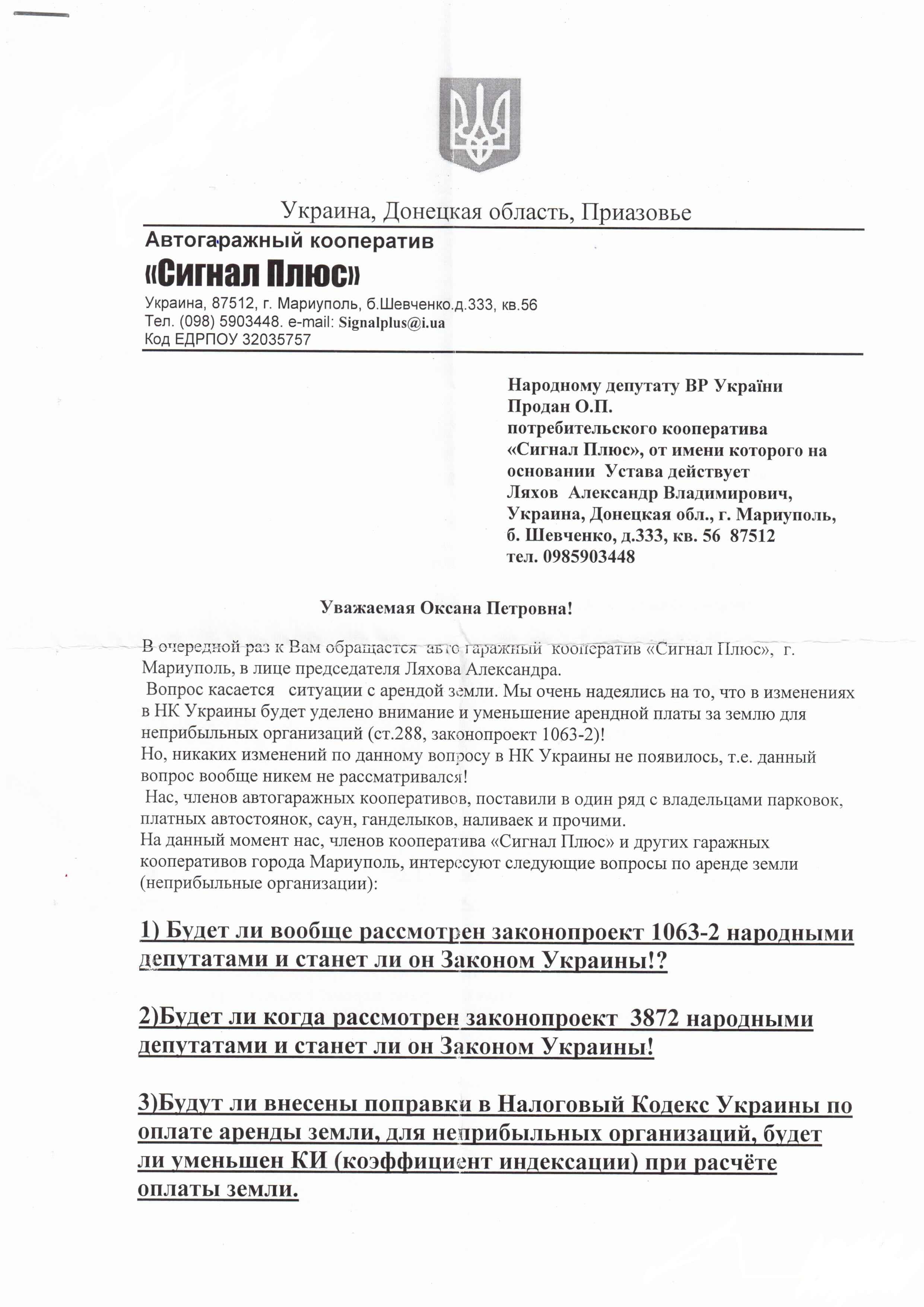 28Лют Коментування вимкнено Лист Автогаражного кооперативу “Сигнал Плюс” щодо орендної плати за землю для неприбуткових організацій