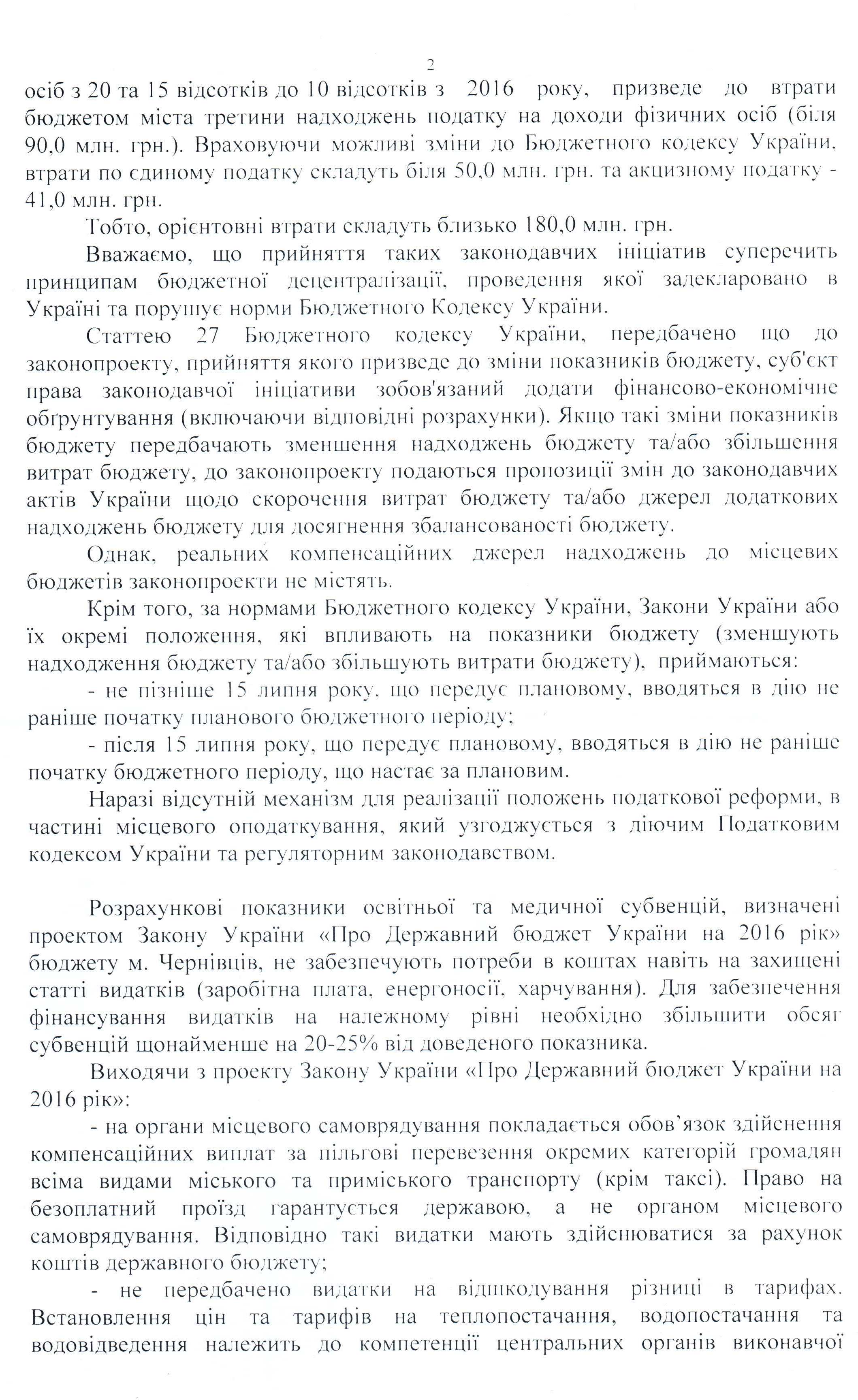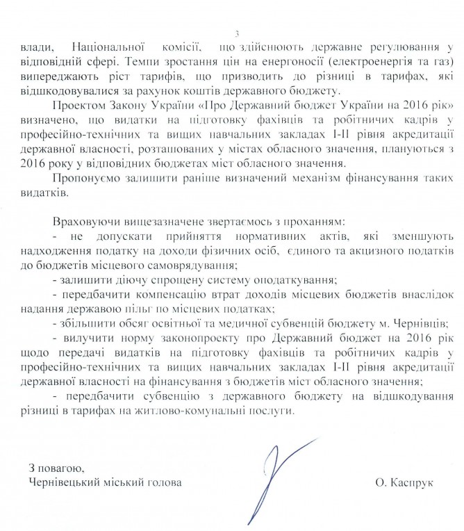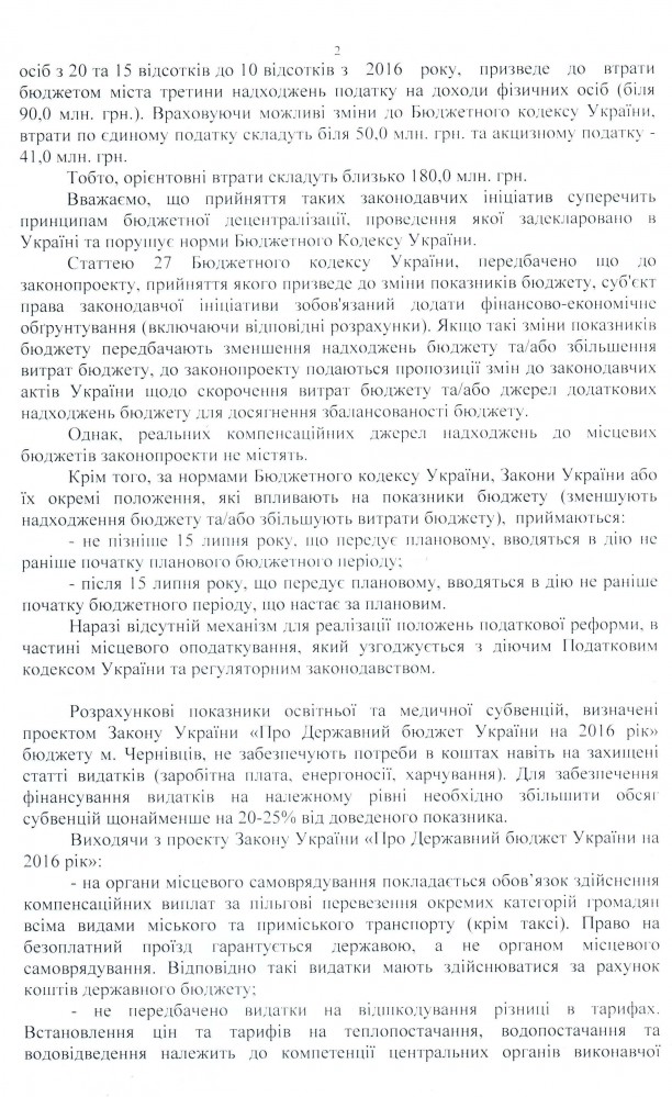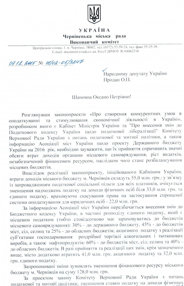 Вхідна документація > Лист Чернівецької міської ради щодо недопущення прийняття проекту Закону України “Про створення конкурентних умов в оподаткуванні та стимулювання економічної діяльності в Україні”, реєстр. №3630, та інших законопроектів, релізація яких зменшить дохідну частину місцевих бюджетів