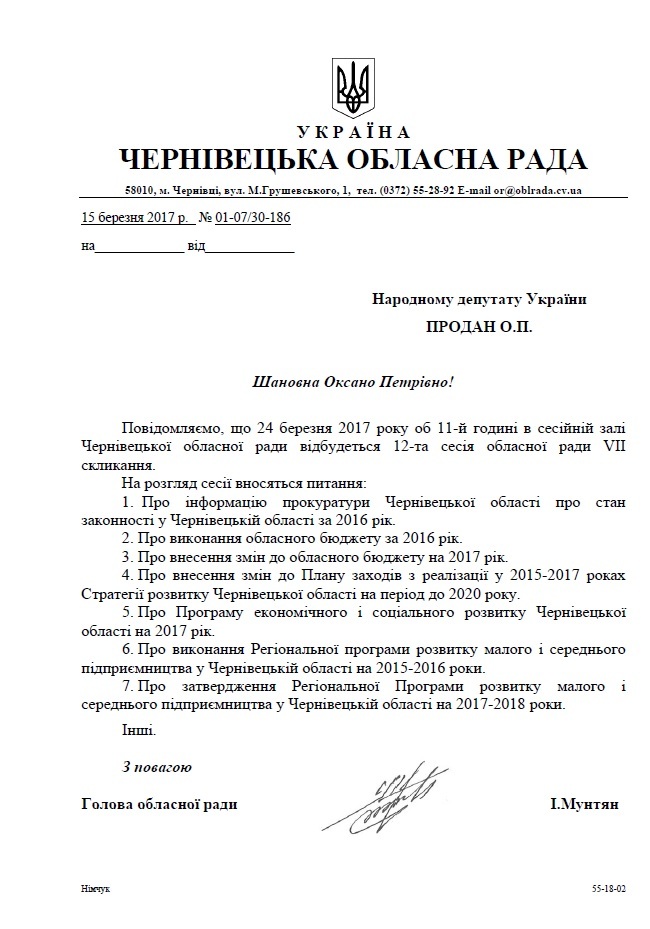 16Бер Коментування вимкнено Лист Чернівецької обласної ради про проведення 12-ї сесії обласної ради VII скликання