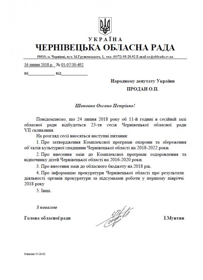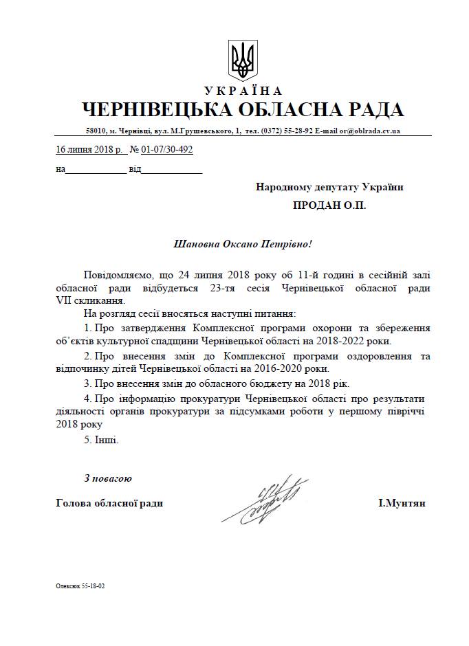 18Лип Коментування вимкнено Лист Чернівецької обласної ради про проведення 23-ї сесії обласної ради VII скликання