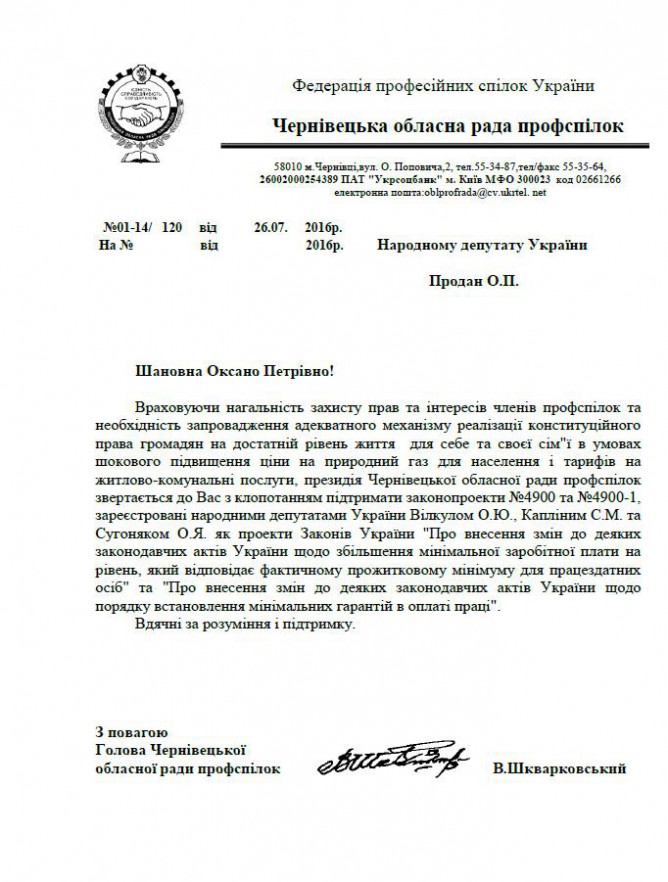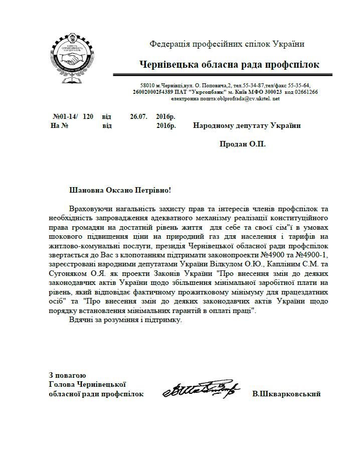 27Лип Коментування вимкнено Лист Чернівецької обласної ради профспілок щодо підтримки законопроектів щодо підвищення мінімальної заробітної плати до рівня прожиткового мінімуму