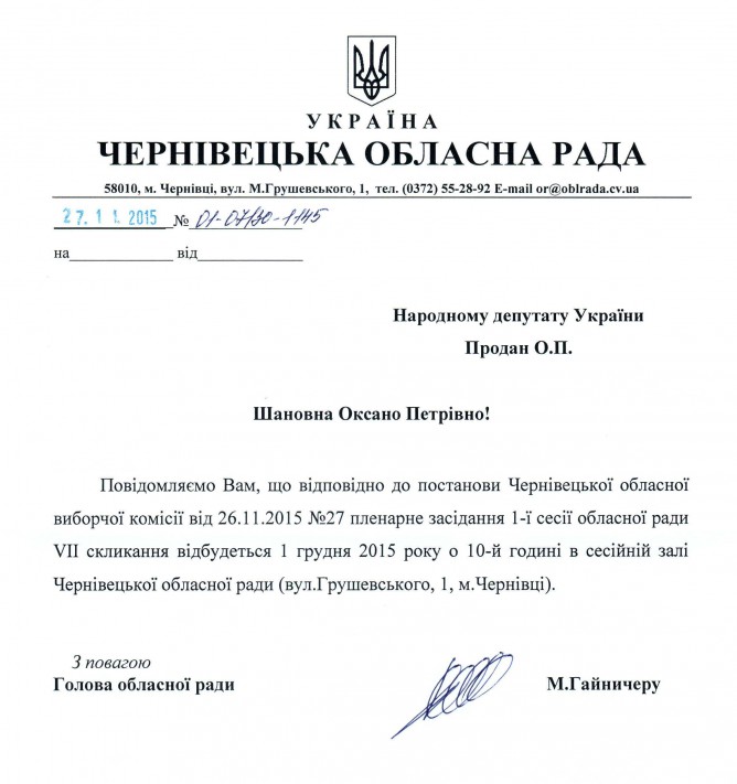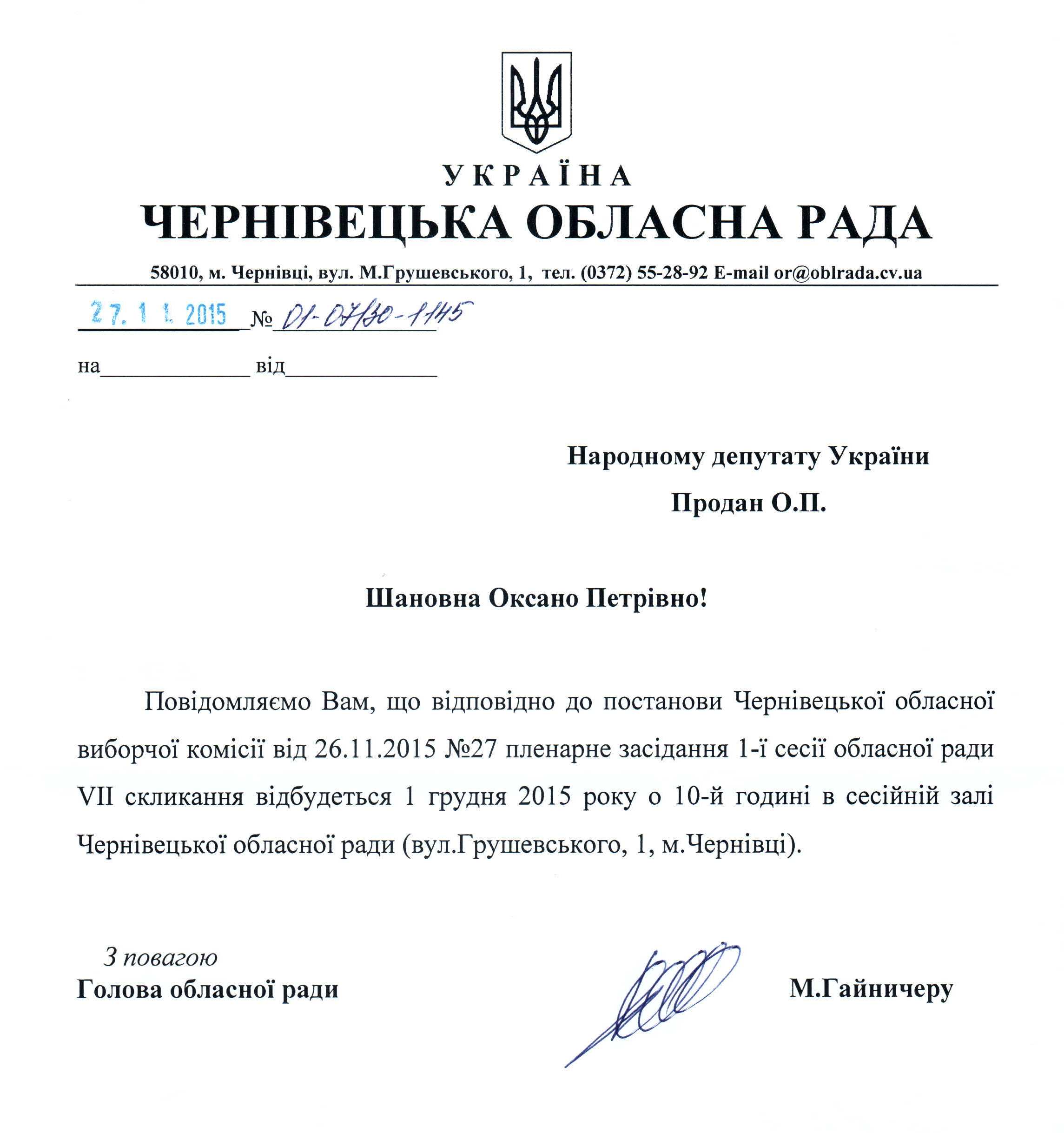 Лист Чернівецької обласної ради щодо пленарного засідання 1-ї сесії обласної ради VII скликання
