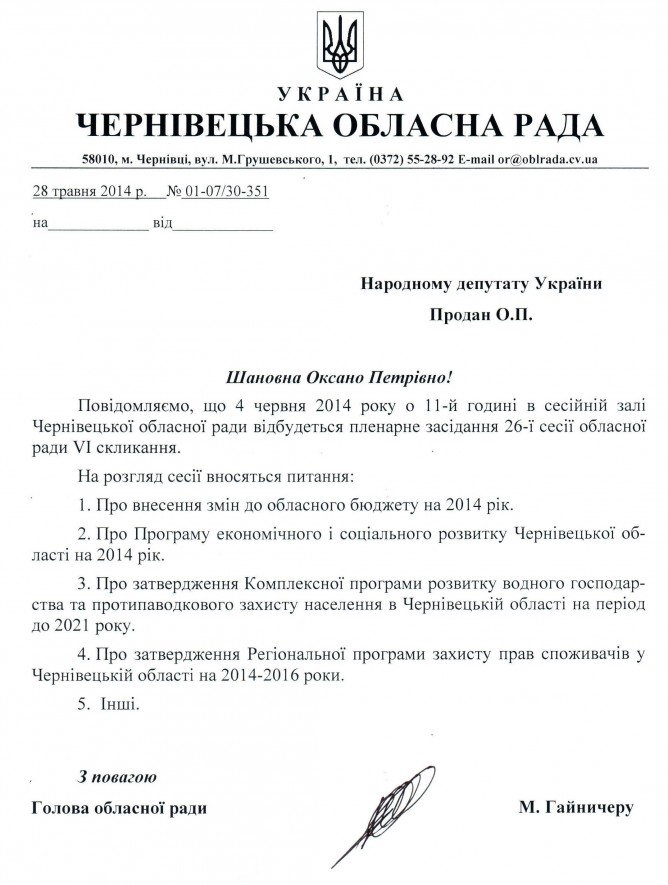 02Чер Коментування вимкнено Лист Чернівецької обласної ради щодо пленарного засідання 26-ї сесії обласної ради