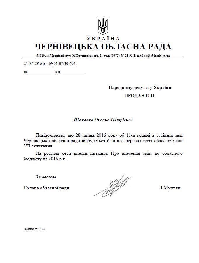 27Лип Коментування вимкнено Лист Чернівецької обласної ради щодо проведення 6-ї позачергової сесії обласної ради VII скликання