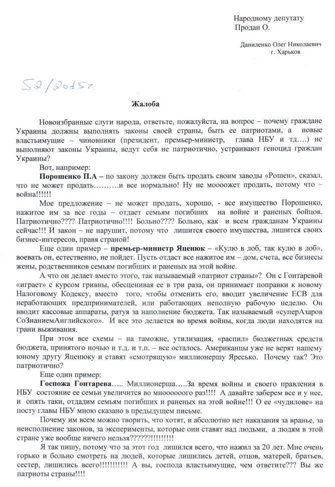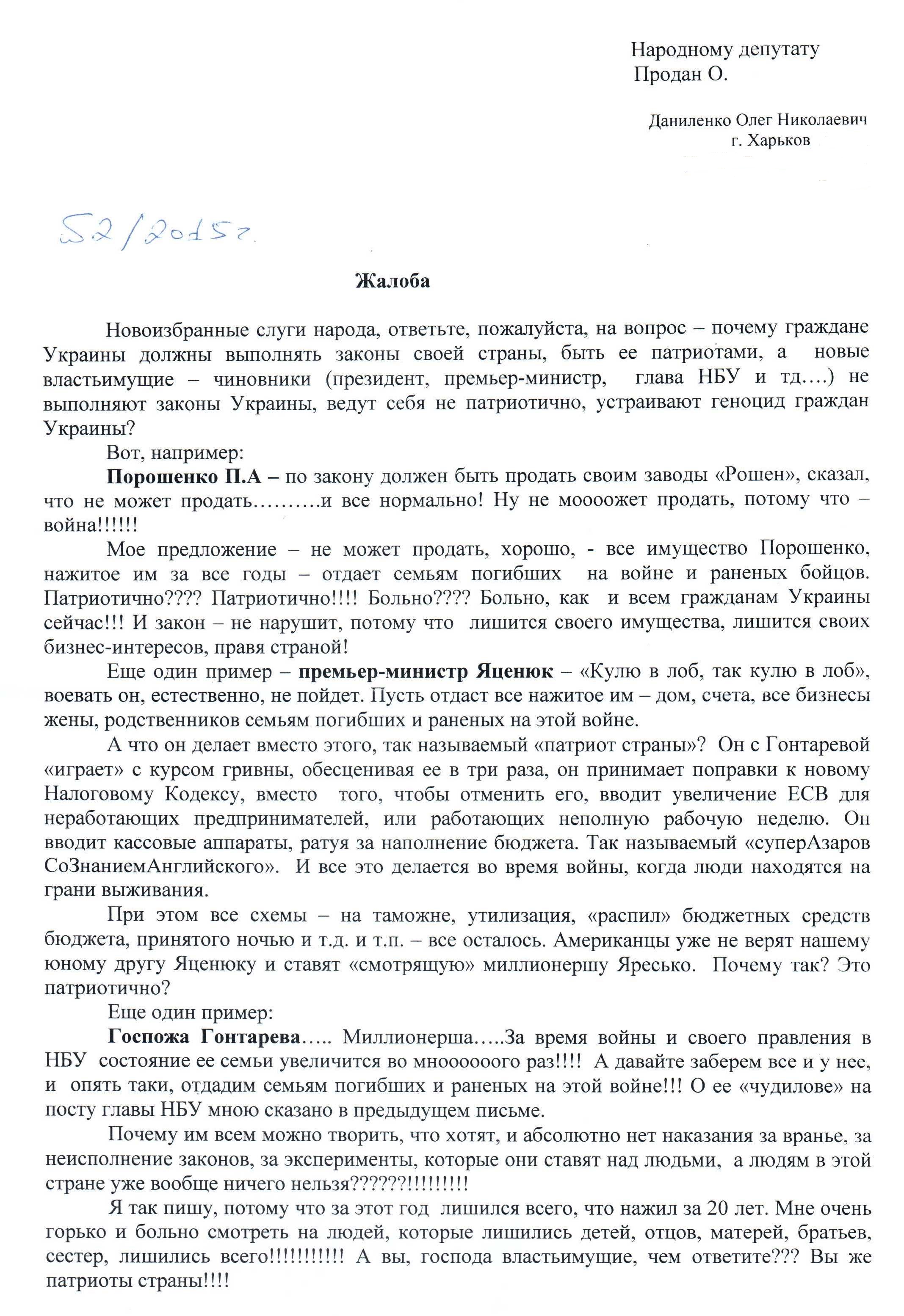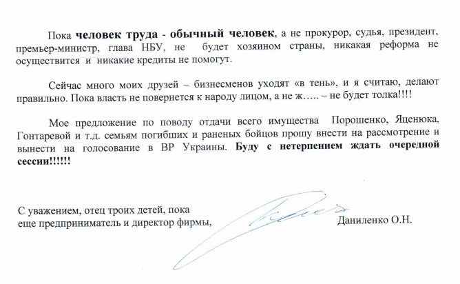 Лист Даниленка О.М. щодо передачі у державну власність майна, що належить чиновникам