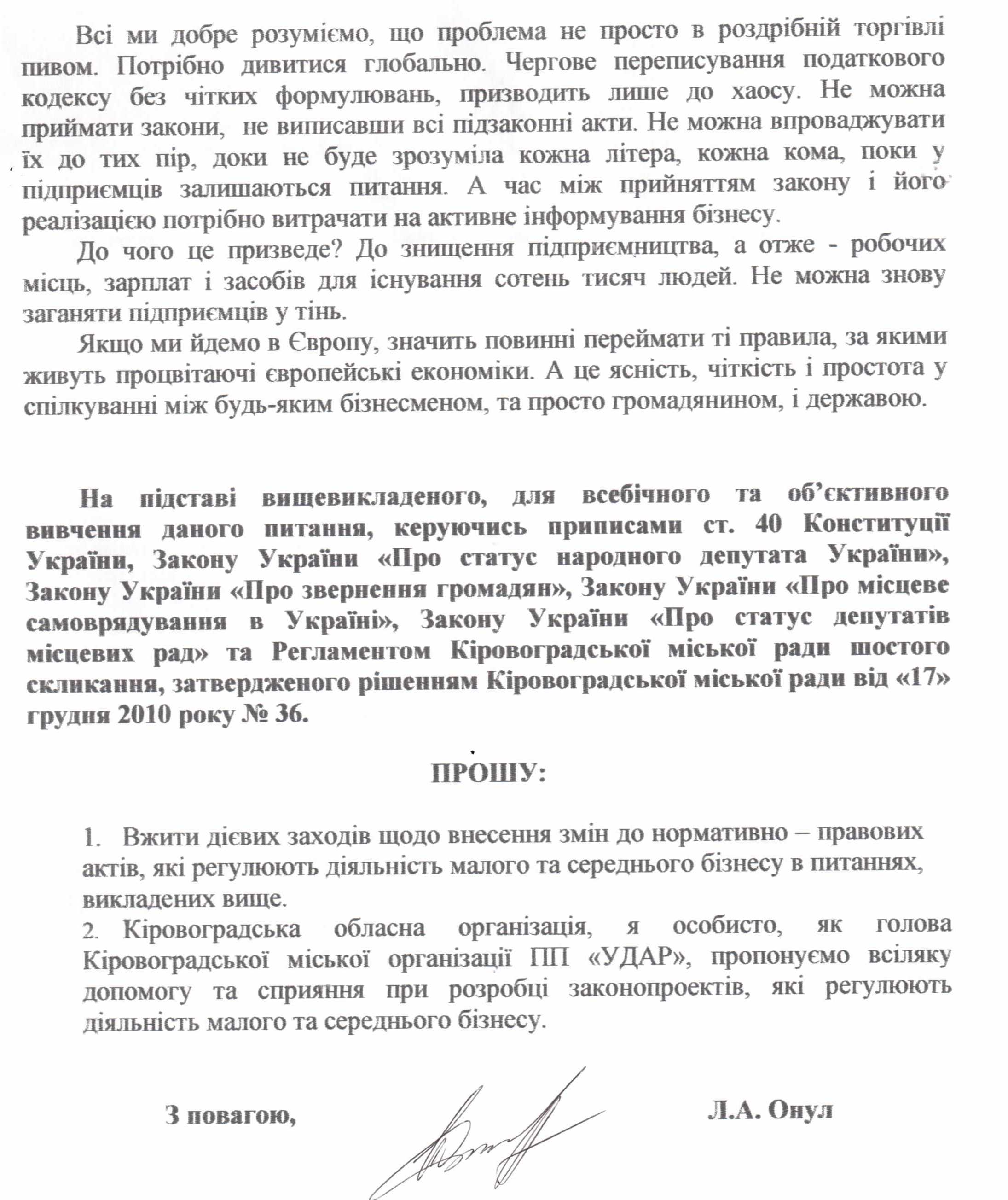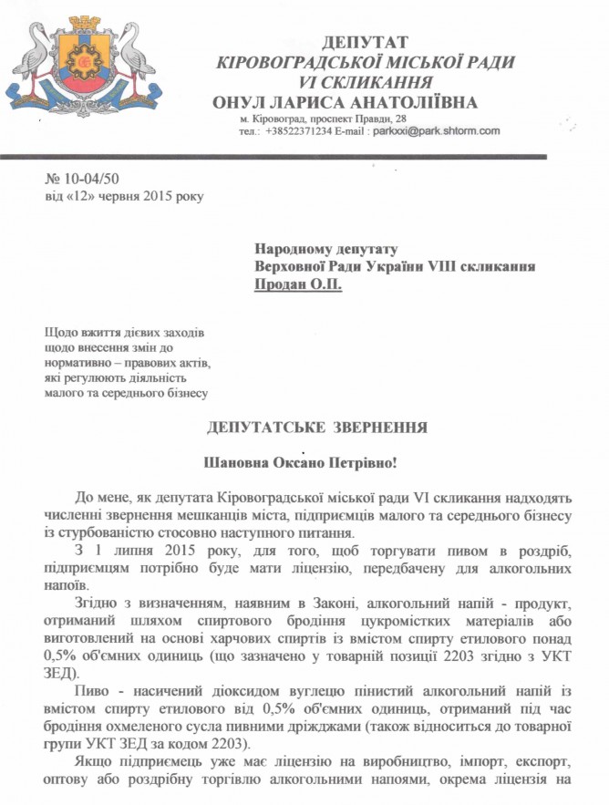 15Лип Коментування вимкнено Лист депутата Кіровоградської міської ради Л.А. Онул щодо вжиття дієвих заходів для внесення змін до законодавчих актів, які регулюють діяльність малого та середнього бізнесу