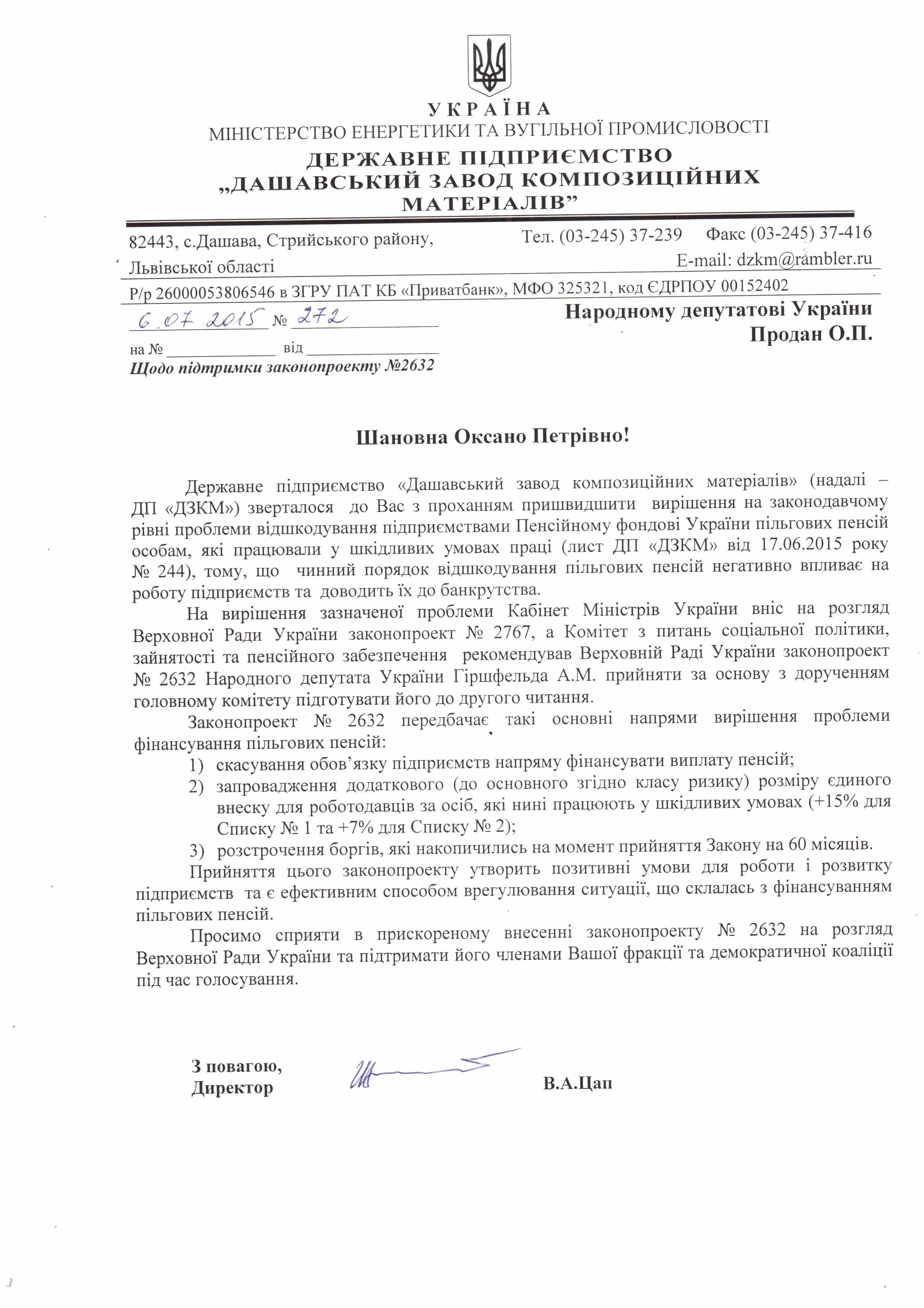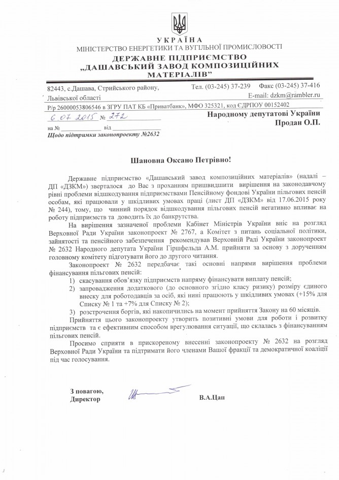 Вхідна документація > Лист ДП “Дашавський завод композиційних матеріалів” щодо підтримки законопроекту “Про внесення змін до деяких законів України (щодо пільгового пенсійного забезпечення окремих категорій осіб)”, реєстр. №2632