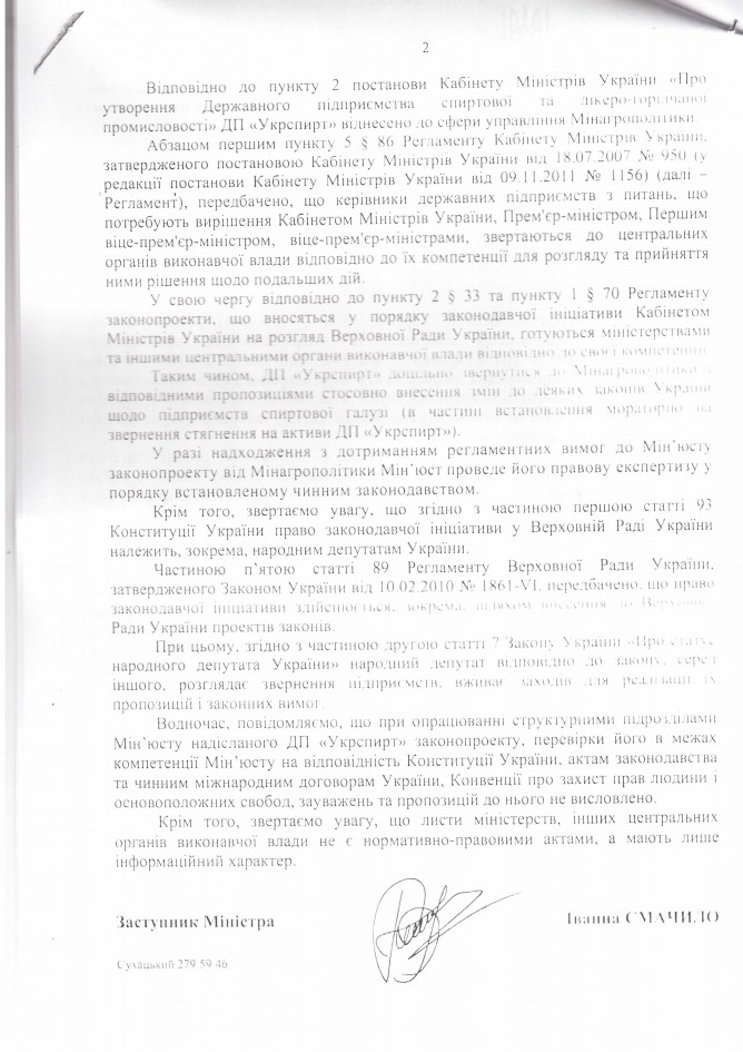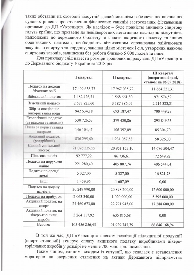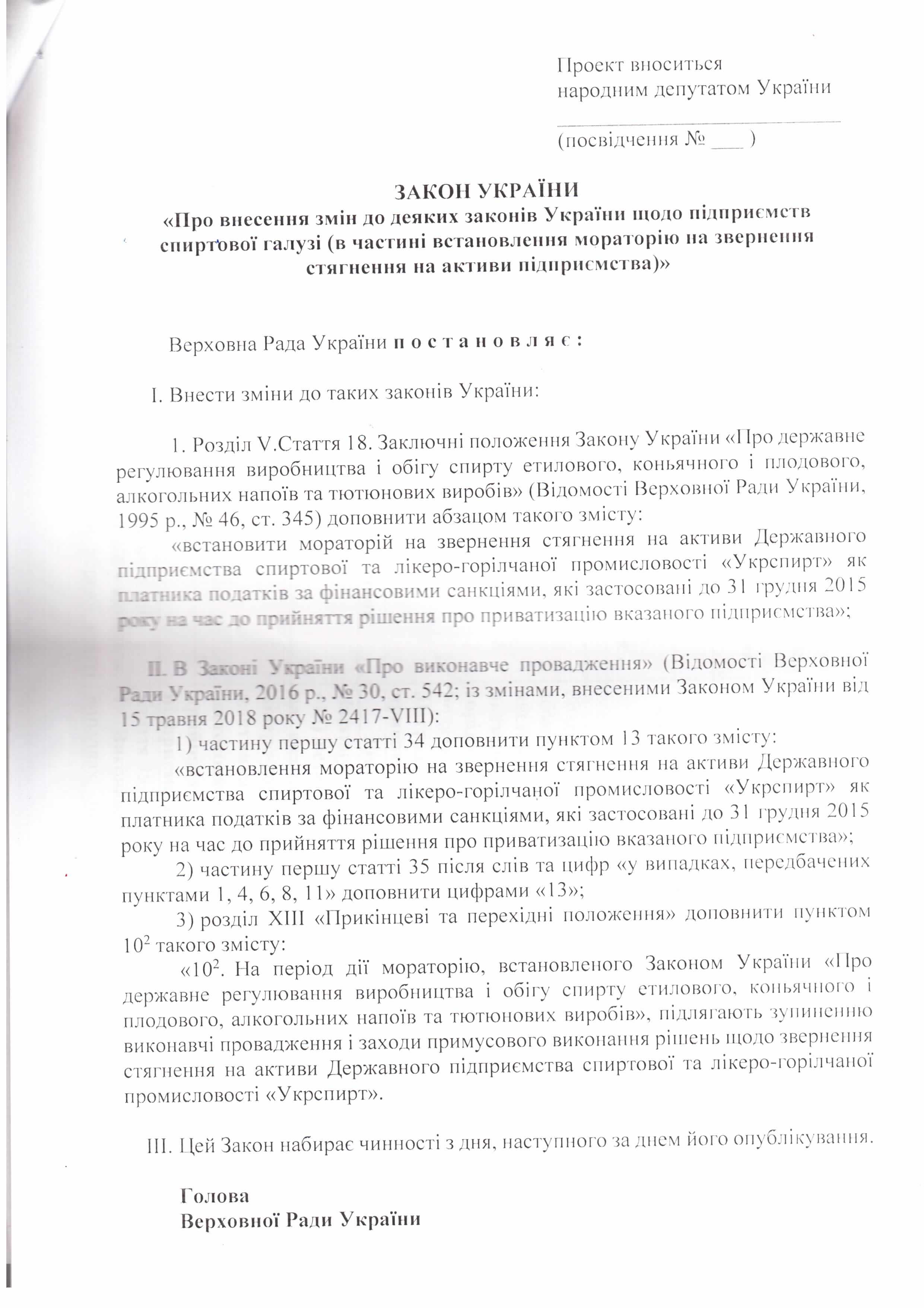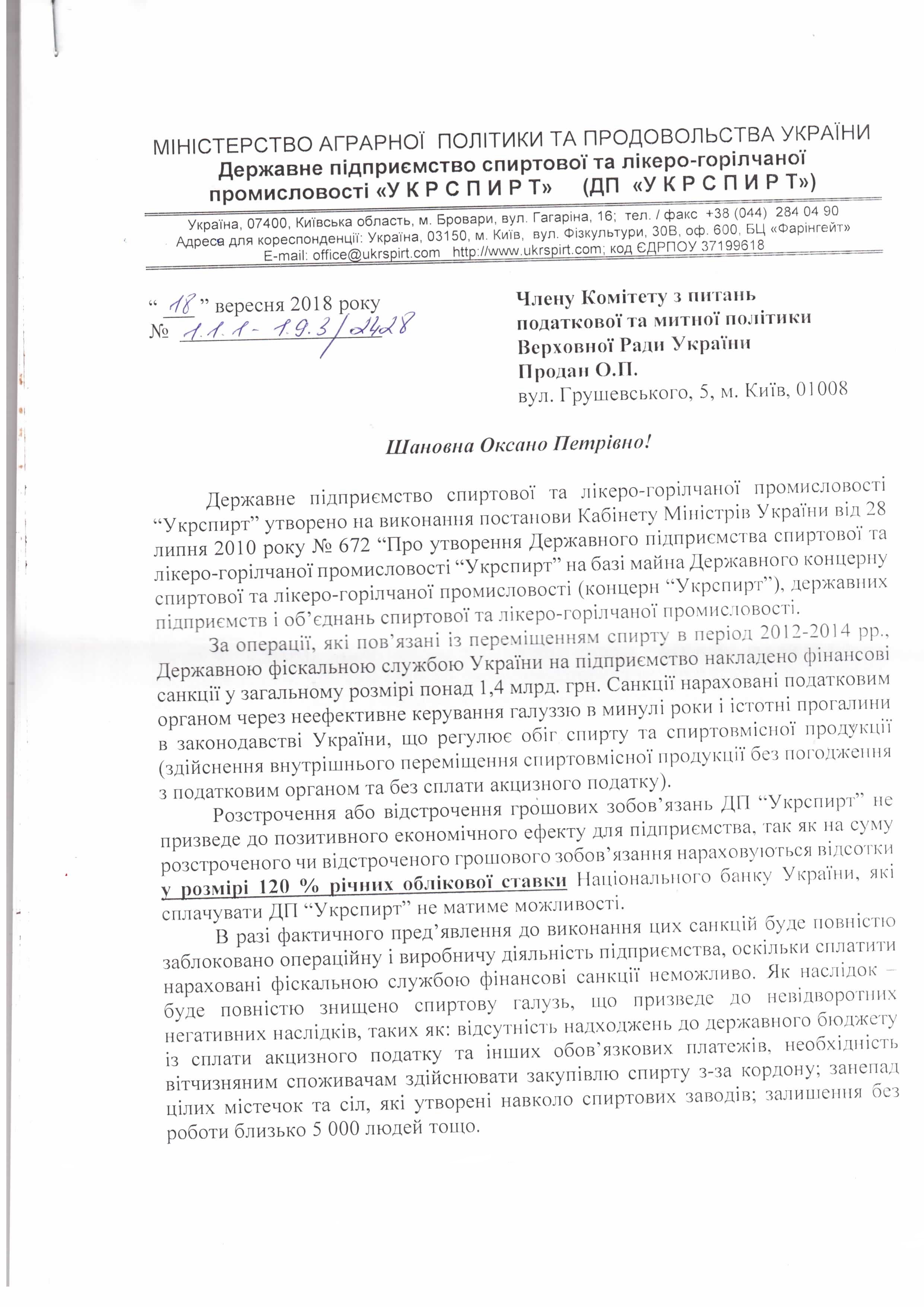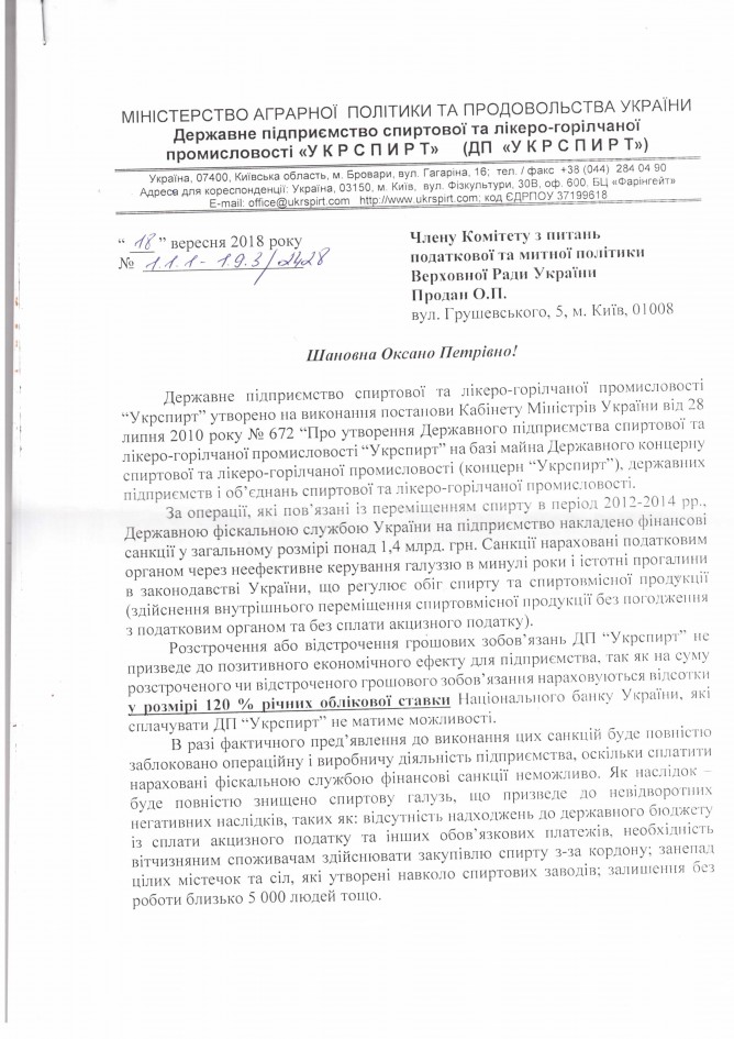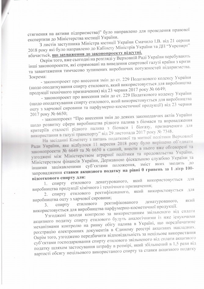 Головна > Верховна Рада України > Вхідна документація > Лист ДП “Укрспирт” щодо законопроекту “Про внесення змін до деяких законів України щодо підприємств спиртової галузі (в частині встановлення мораторію на звернення стягнення на активи підприємства)”, розроблений підприємством)