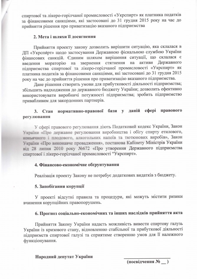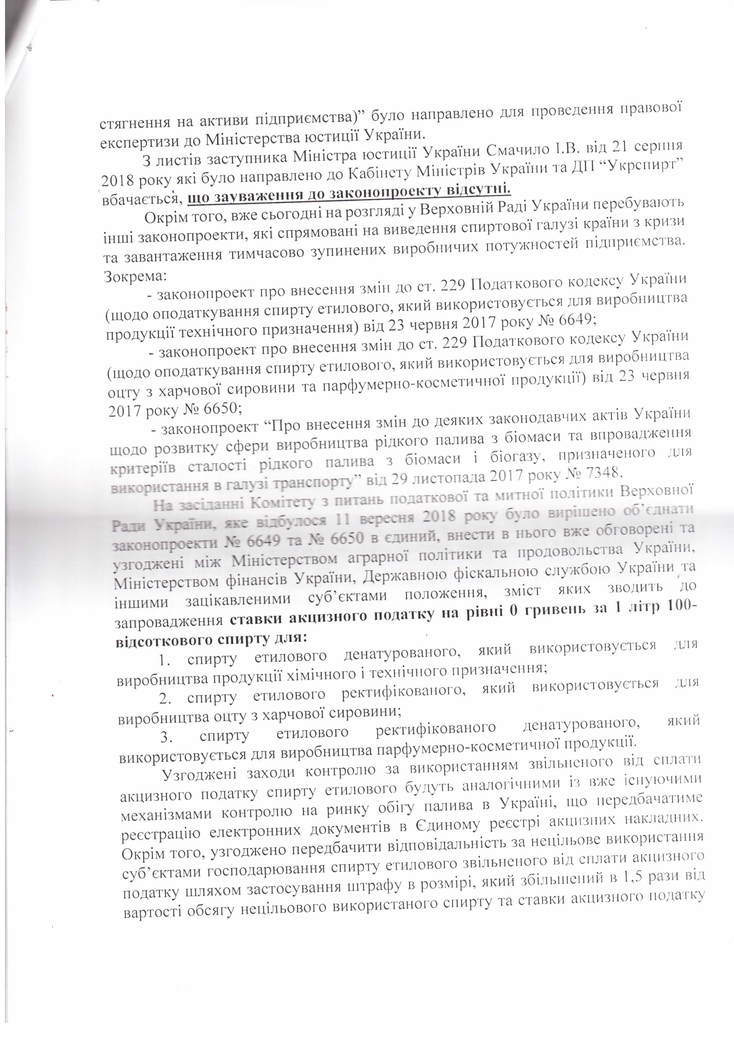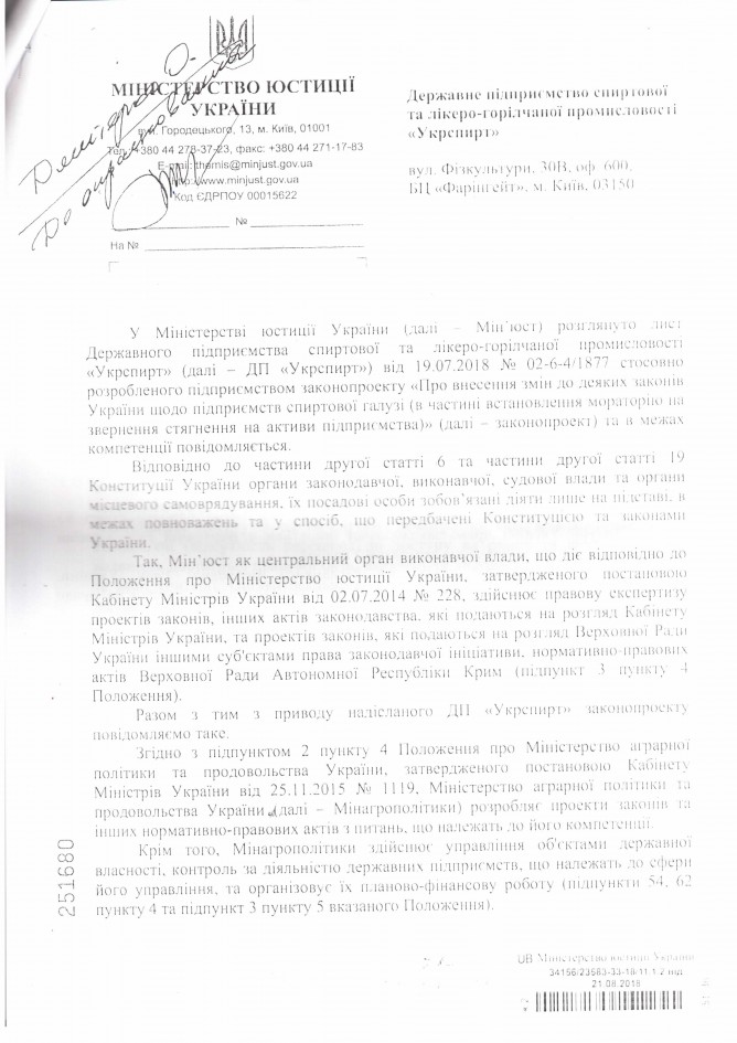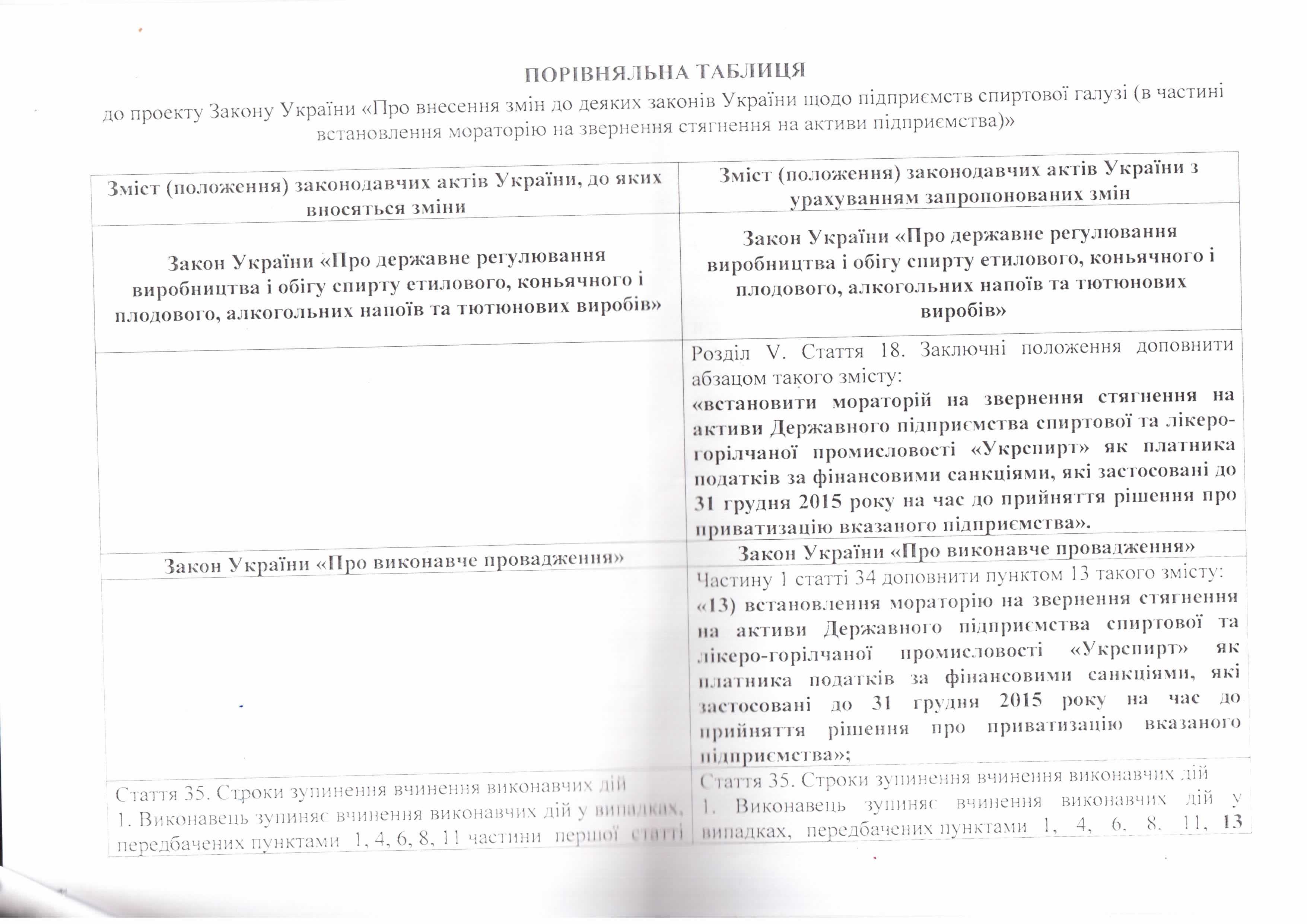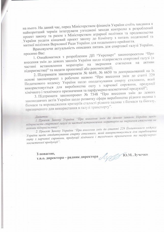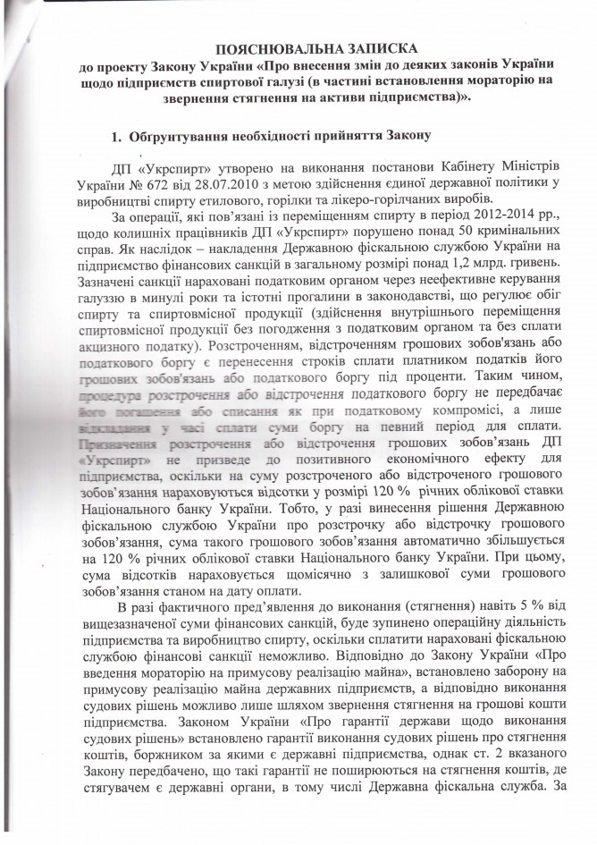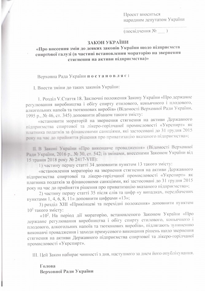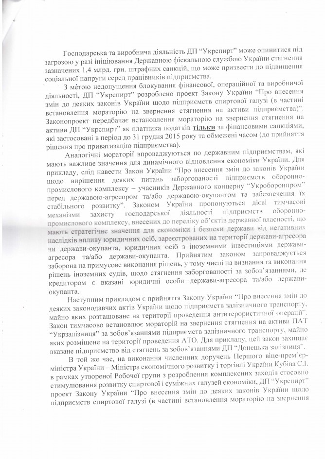 Лист ДП “Укрспирт” щодо законопроекту “Про внесення змін до деяких законів України щодо підприємств спиртової галузі (в частині встановлення мораторію на звернення стягнення на активи підприємства)”, розроблений підприємством)