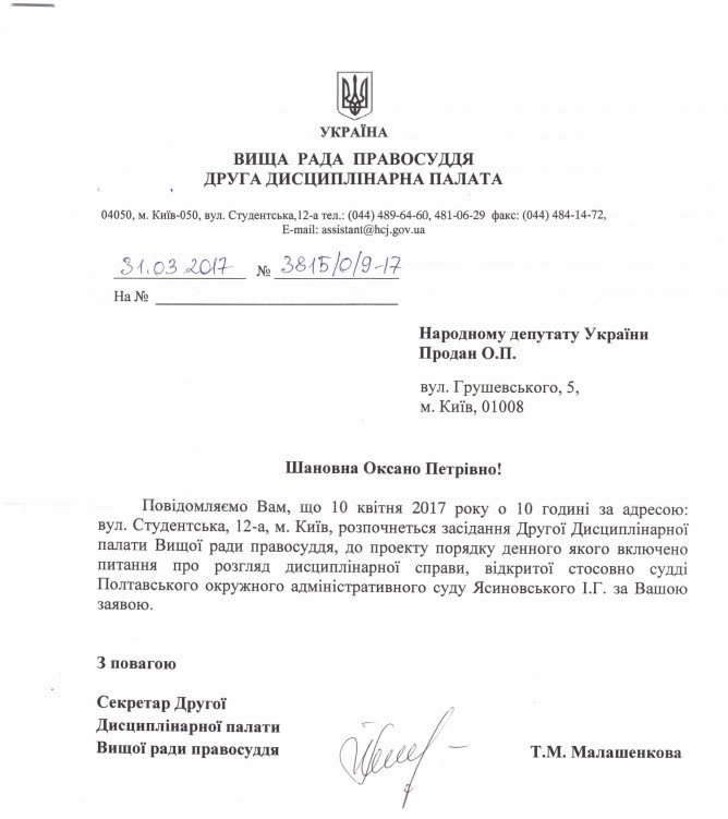 07Кві Коментування вимкнено Лист Другої Дисциплінарної палати Вищої Ради Правосуддя щодо розгляду дисциплінарної справи стосовно судді Полтавського окружного адміністративного суду І.Г. Ясиновського ДЕПУТАТСЬКЕ ЗВЕРНЕННЯ