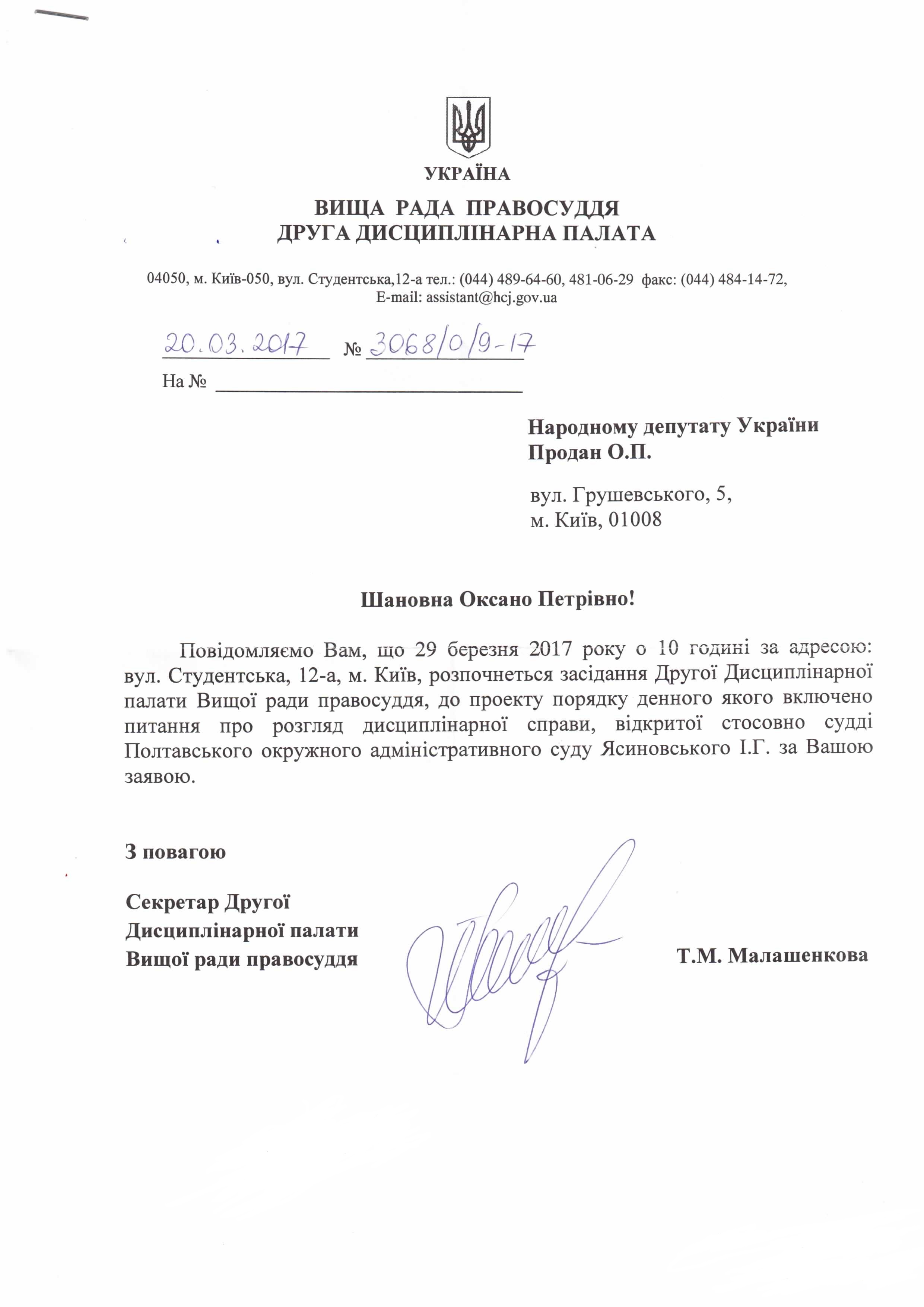 27Бер Коментування вимкнено Лист Другої Дисциплінарної палати Вищої Ради Правосуддя щодо розгляду дисциплінарної справи стосовно судді Полтавського окружного адміністративного суду І.Г. Ясиновського ДЕПУТАТСЬКЕ ЗВЕРНЕННЯ