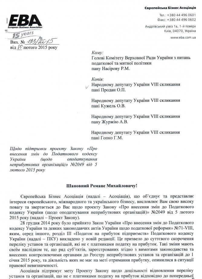 03Бер Коментування вимкнено Лист Європейської Бізнес Асоціації про підтримку законопроекту щодо оподаткування неприбуткових організацій, реєстр. №2049