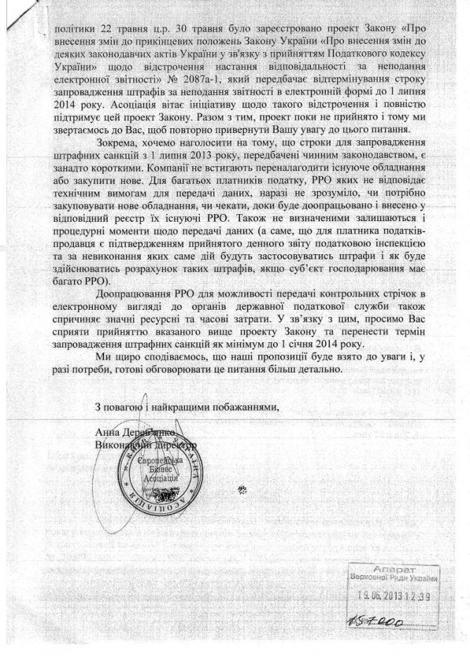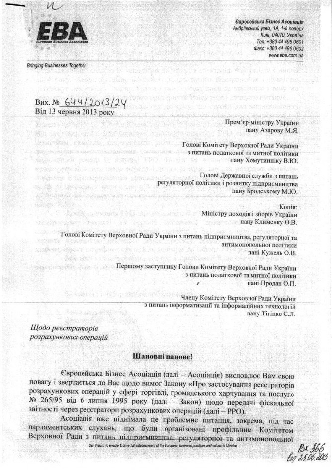 Головна > Верховна Рада України > Вхідна документація > Лист Європейської Бізнес Асоціації щодо відтермінування відповідальності за неподання електронної звітності підприємцями, які використовують РРО