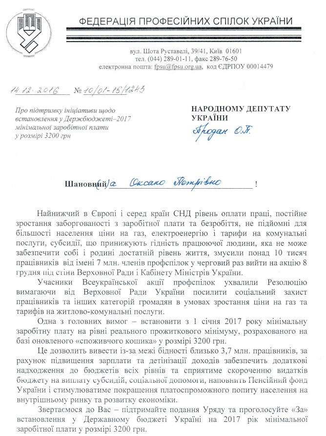 18Січ Коментування вимкнено Лист Федерації професійних спілок України щодо підтримки ініціативи встановлення мінімальної заробітної плати у розмірі 3200 гривень