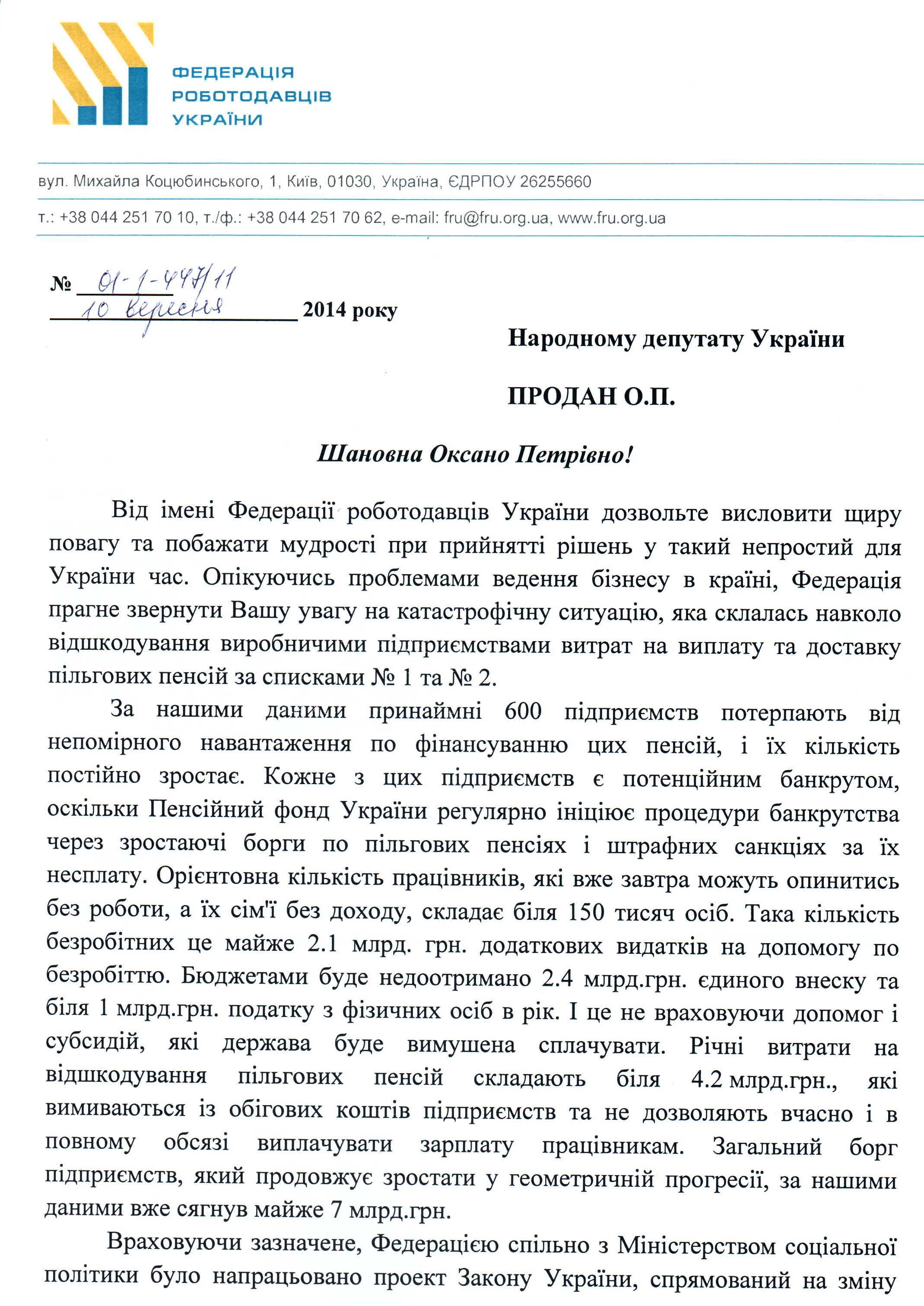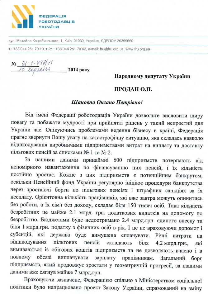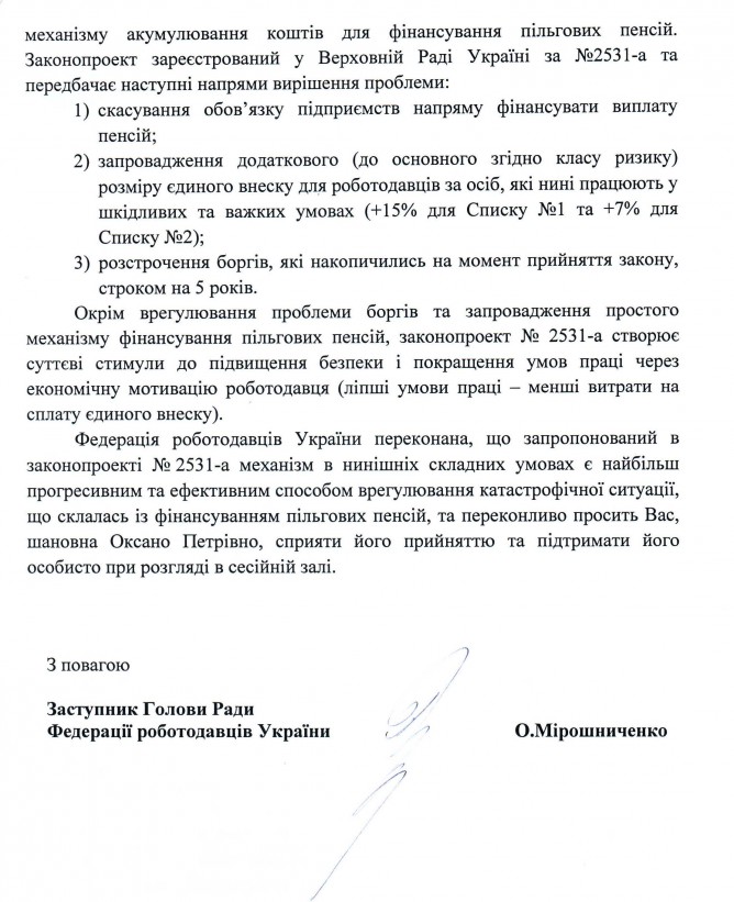 02Жов Коментування вимкнено Лист Федерації роботодавців України щодо підтримки законопроекту “Про внесення змін до деяких законів України (щодо пільгового пенсійного забезпечення окремих категорій осіб)”, реєстр. №2531а
