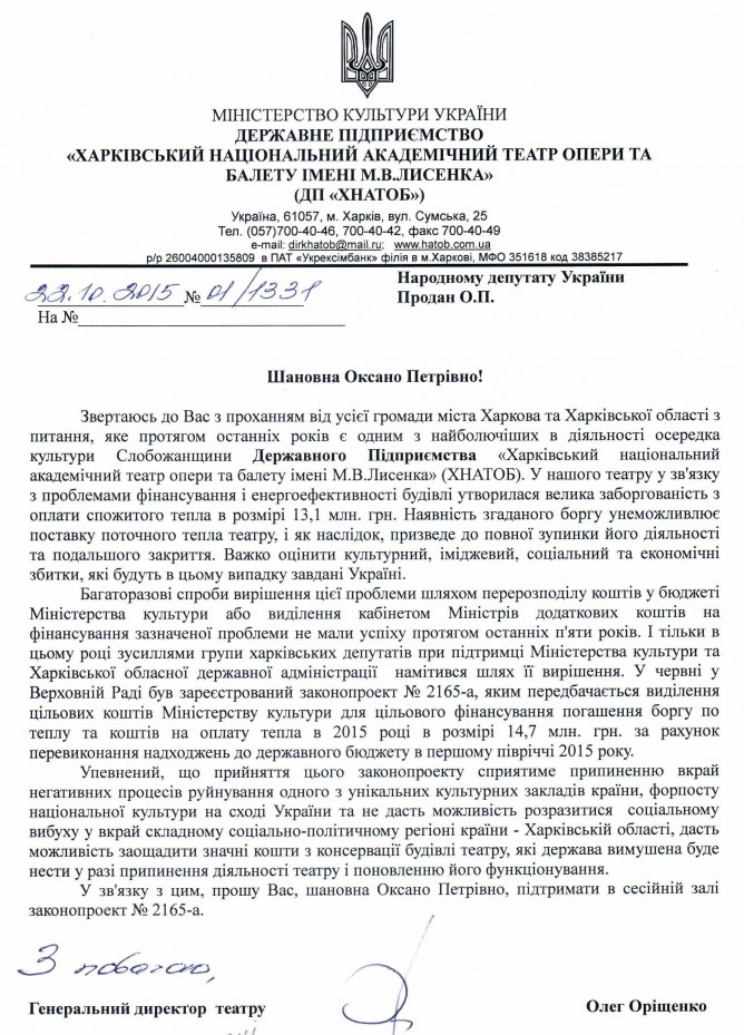 Вхідна документація > Лист Харківського Національного академічного театру опери та балету ім. М.В. Лисенка щодо підтримки законопроекту стосовно збільшення видатків до бюджету Мінкультури за рахунок перевиконання надходжень до держбюджету, реєстр. №2165а