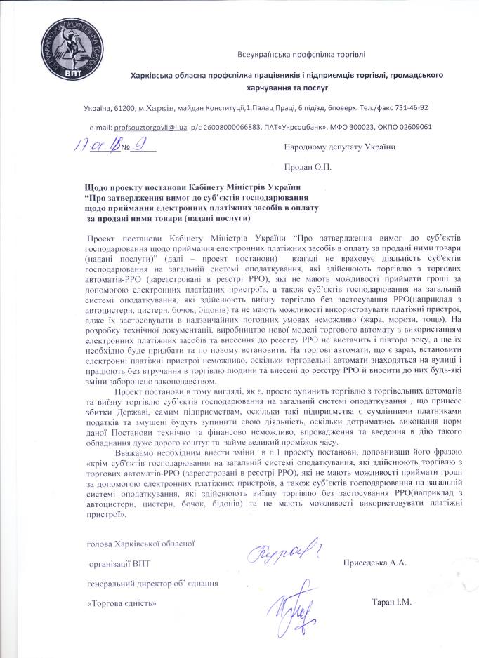 Вхідна документація > Лист Харківської обласної профспілки працівників і підприємців торгівлі, громадського харчування та послуг щодо проекту постанови КМУ “Про затвердження вимог до суб’єктів господарювання щодо приймання електронних платіжних засобів в оплату за продані ними товари (надані послуги)”