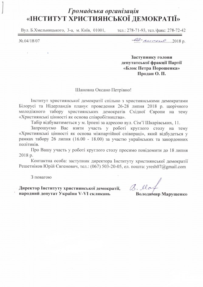 09Лип Коментування вимкнено Лист ГО “Інститут християнської демократії” щодо проведення круглого столу на тему “Християнські цінності як основа міжпартійної співпраці”, 26.07.2018 року