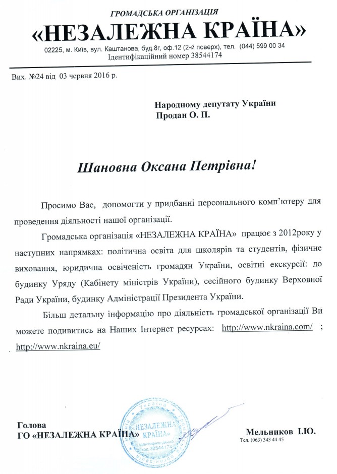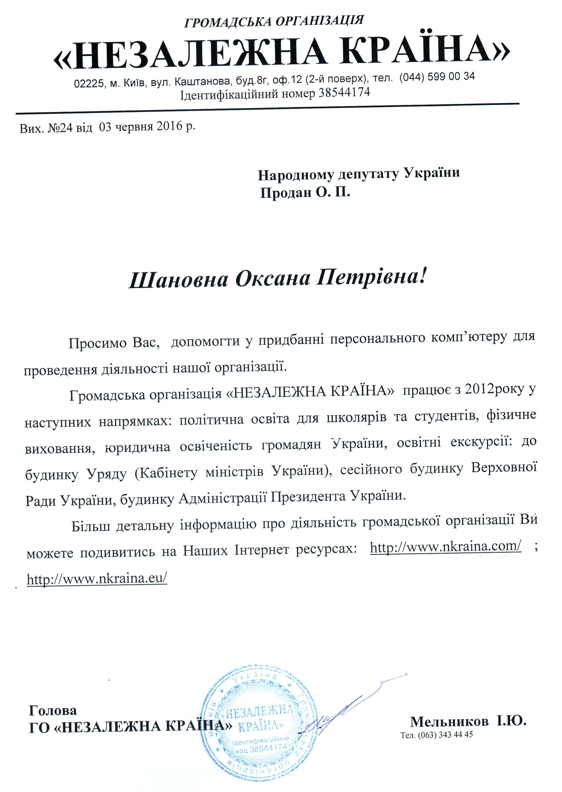 30Чер Коментування вимкнено Лист ГО “Незалежна країна” щодо надання мтеріальної допомоги на придбння комп’ютера