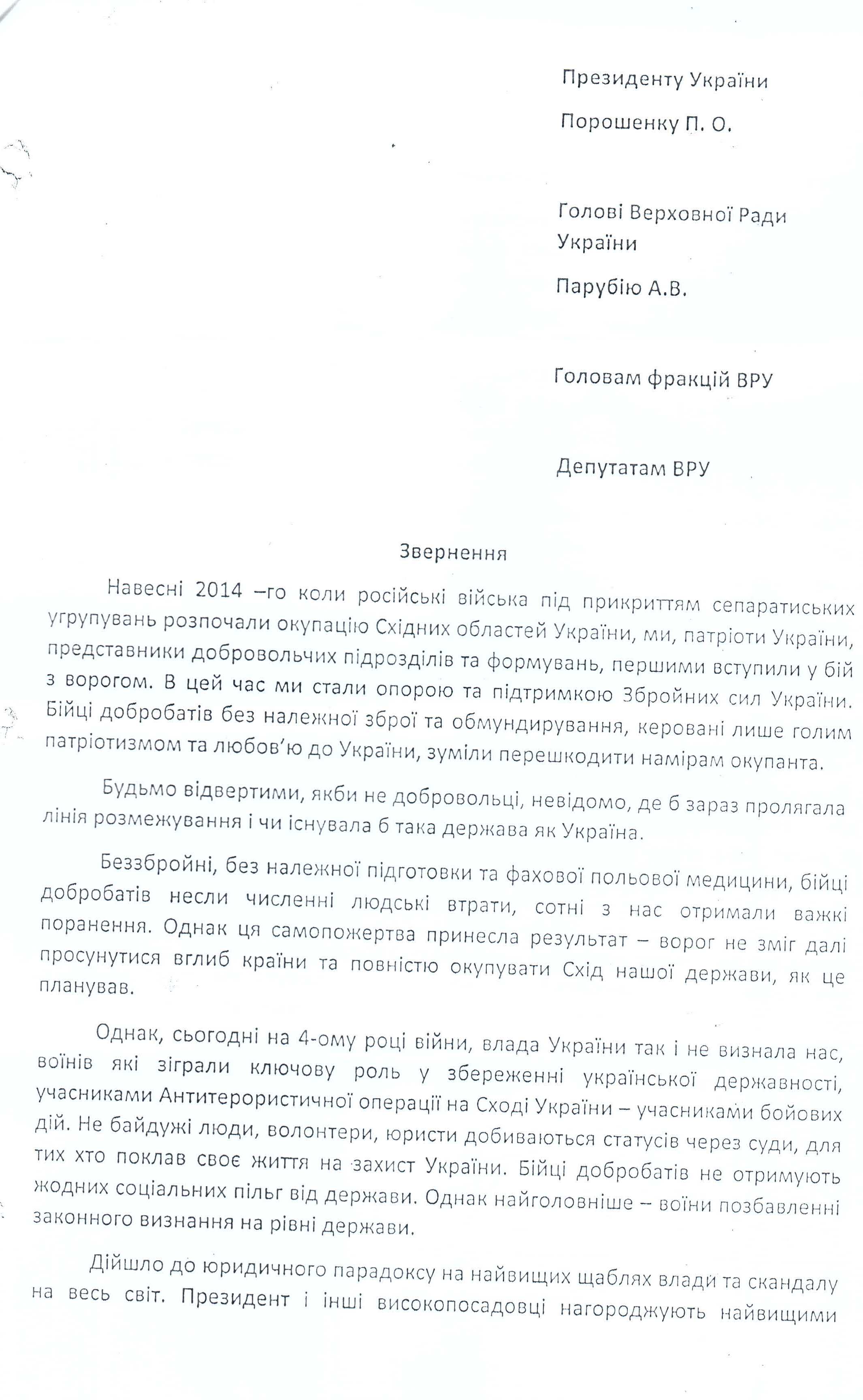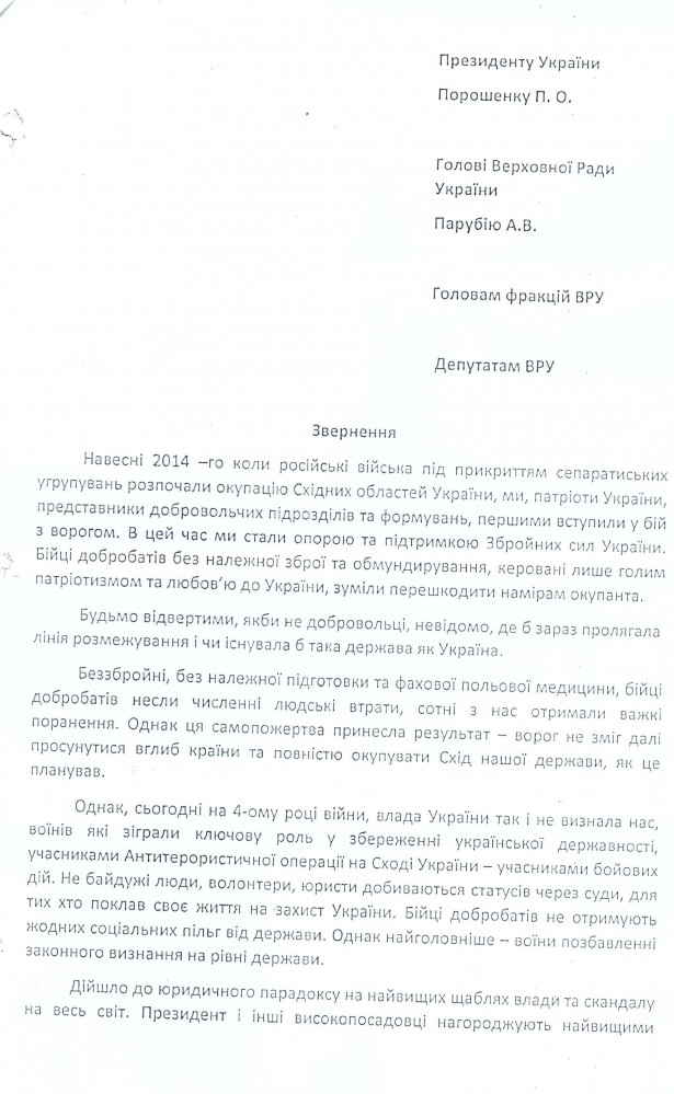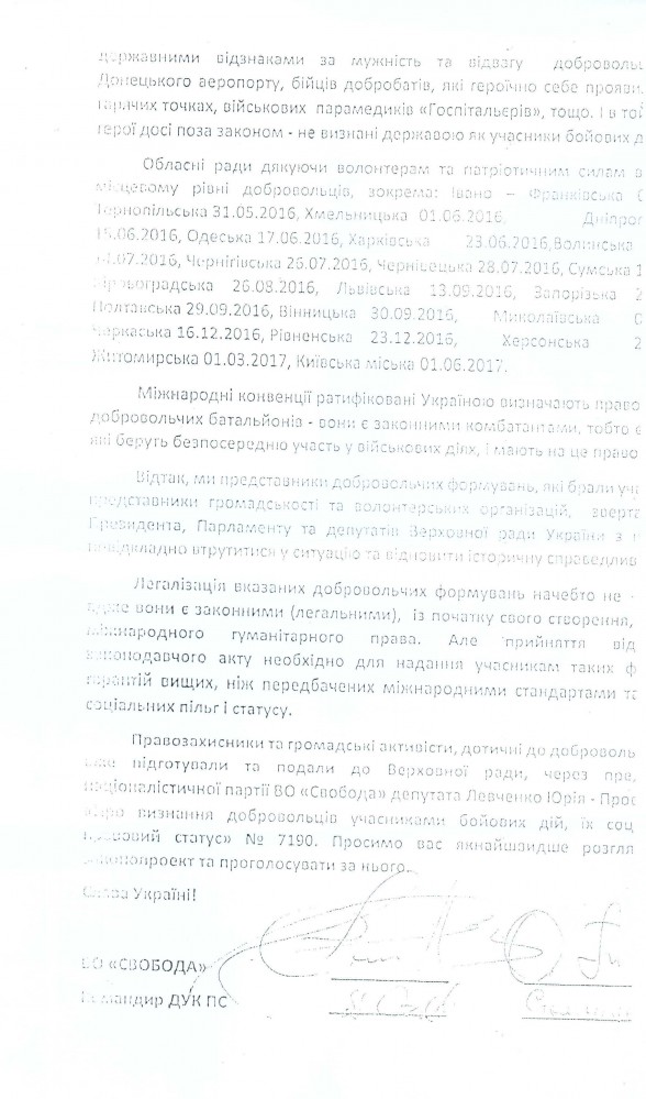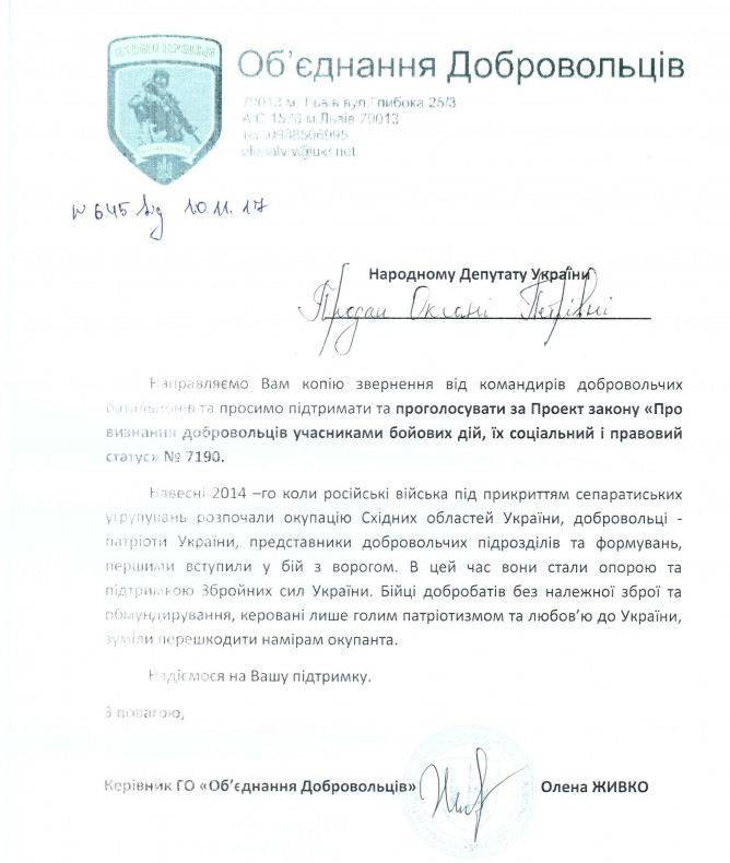 14Гру Коментування вимкнено Лист ГО “Об’єднання Добровольців” щодо підтримки проекту Закону України “Про визнання добровольців учасниками бойових дій, їх соціальний і правовий статус”, реєстр. №7190
