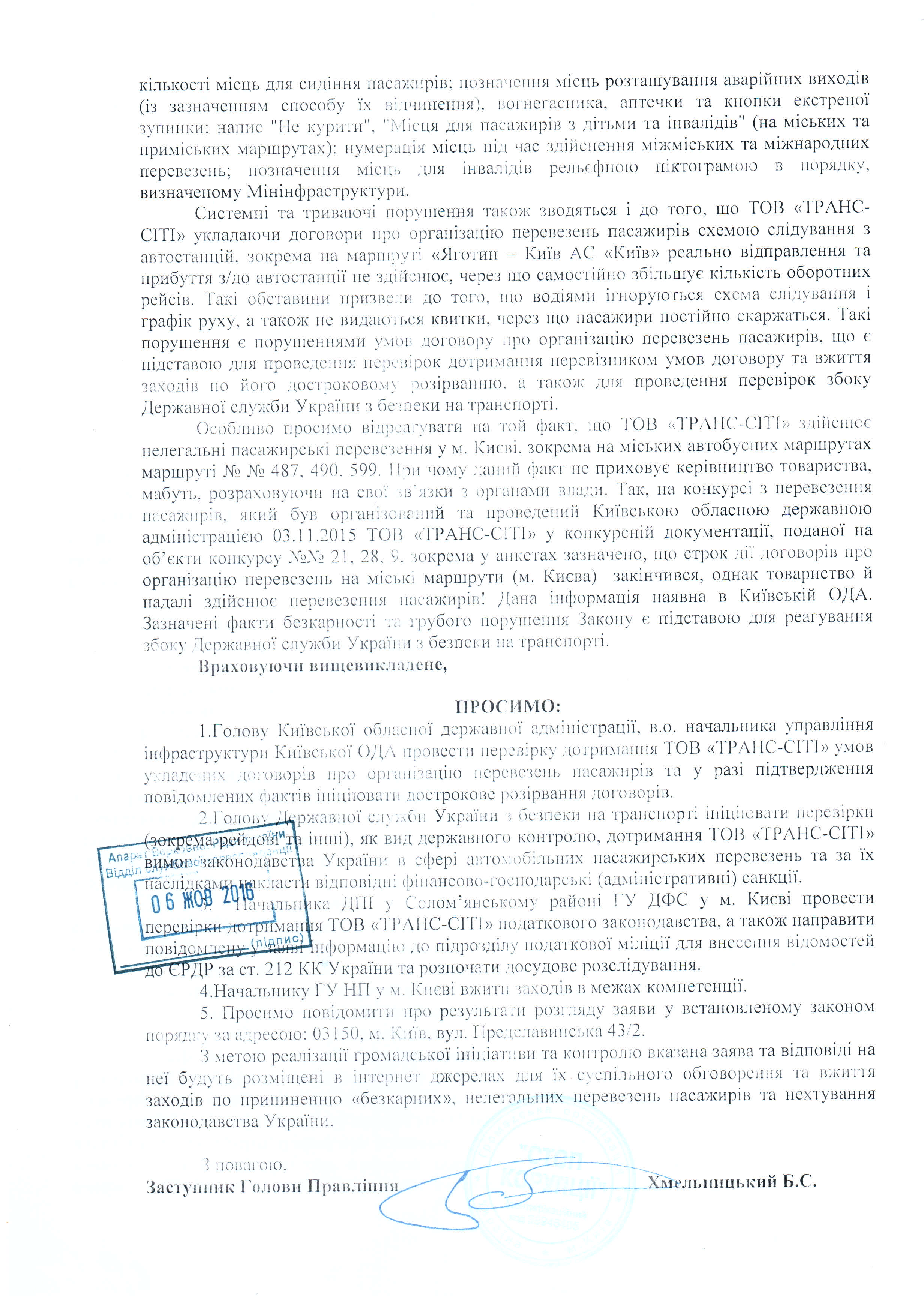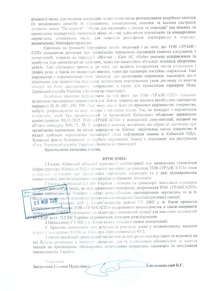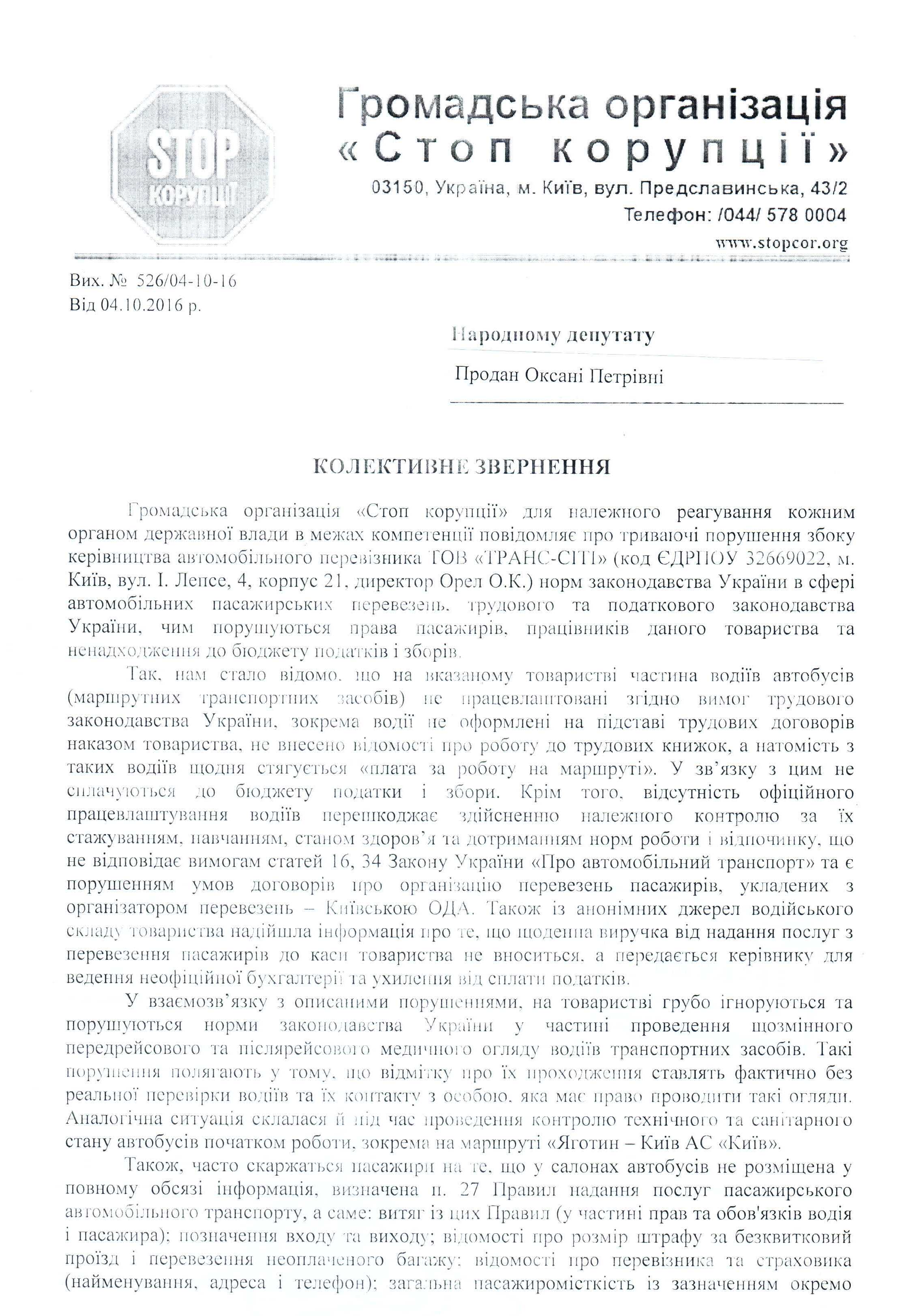 > Лист ГО “Стоп корупції” щодо нелегальних перевезень