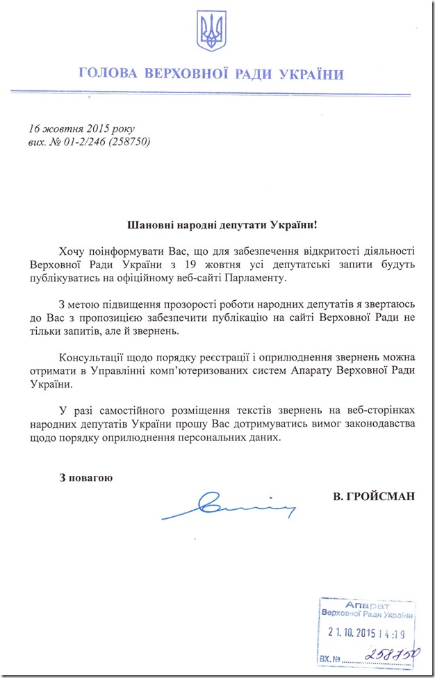 29Жов Коментування вимкнено Лист Голови Верховної Ради України В.Гройсмана щодо оприлюднення на офіційному сайті Парламенту депутатських запитів та депутатських звернень
