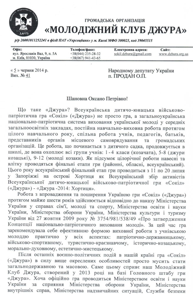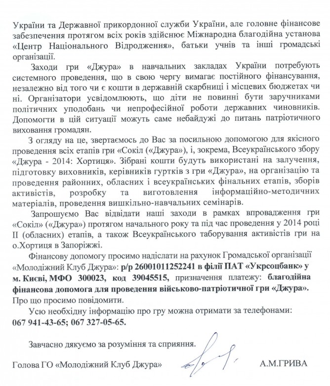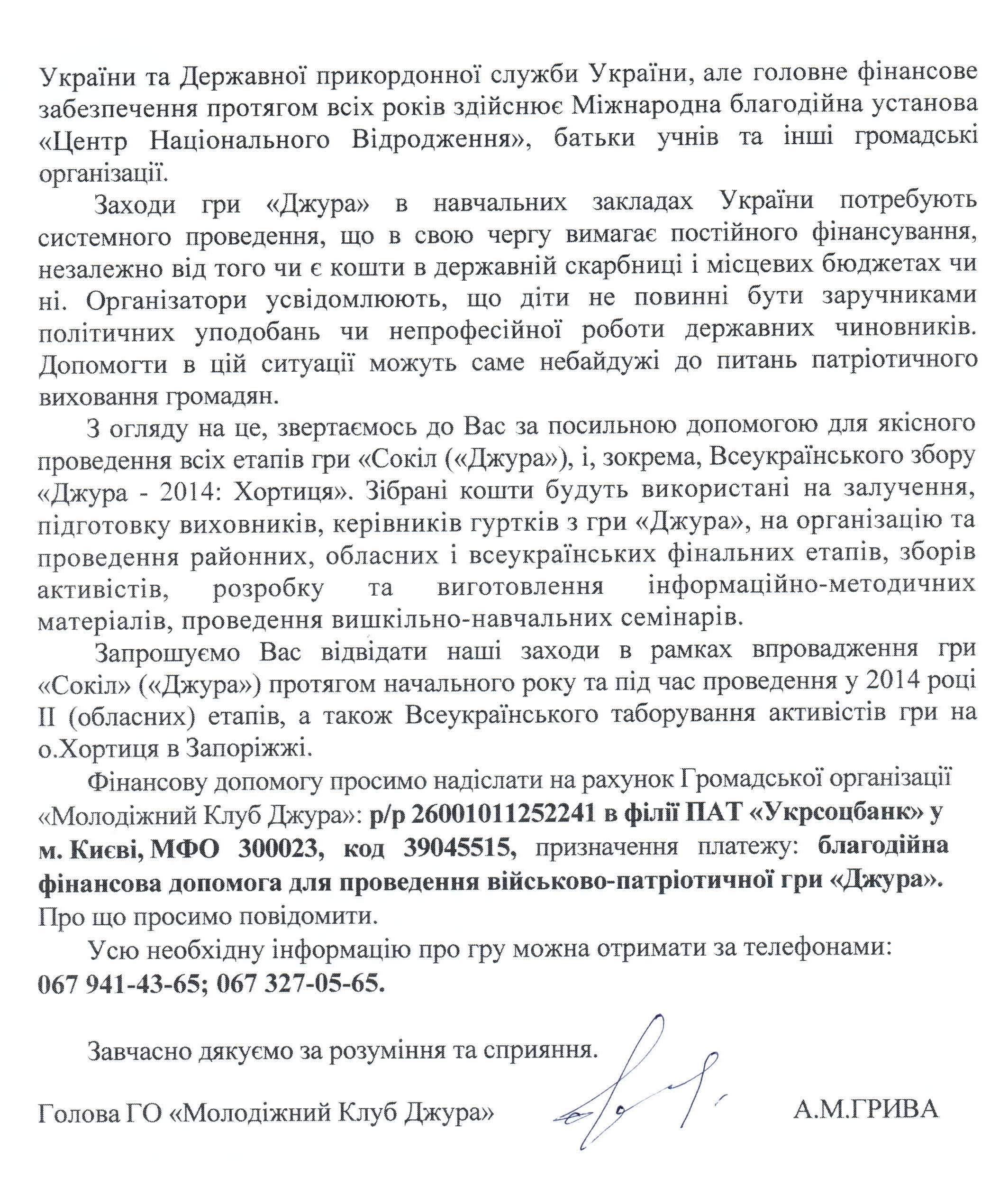 23Чер Коментування вимкнено Лист Громадської організації “Молодіжний клуб Джура” щодо фінансової підтримки Всеукраїнської дитячо-юнацької військово-патріотичної гри “Сокіл” – “Джура – 2014: Хортиця”
