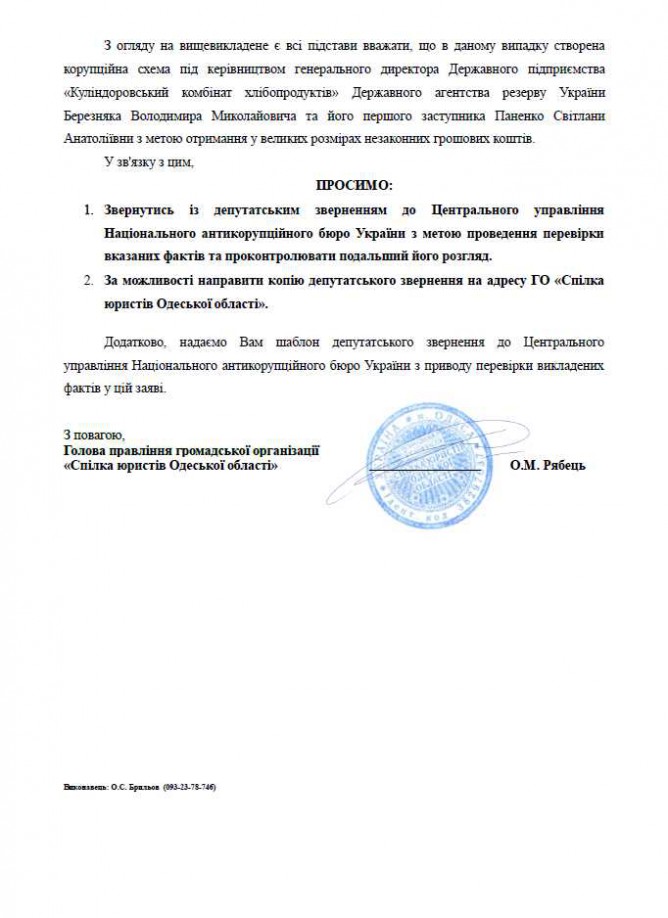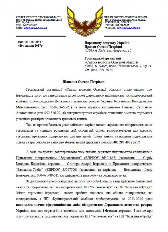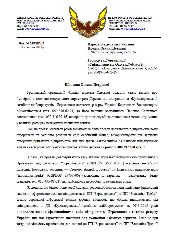 07Сер Коментування вимкнено Лист Громадської організації “Спілка юристів Одеської області” щодо зловживання службовим становищем керівництвом ДП “Куліндоровський комбінат хлібопродуктів”
