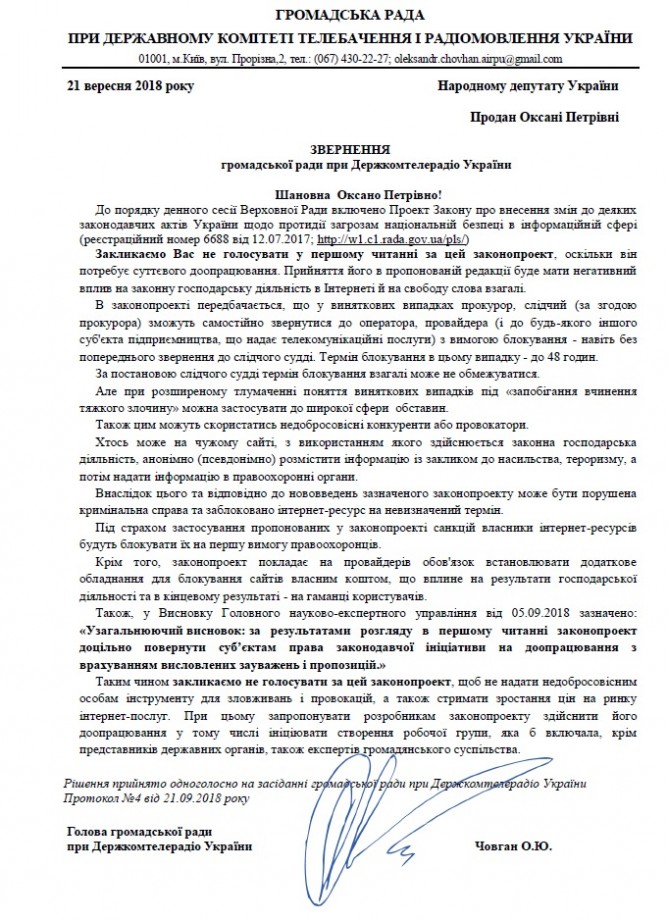 Вхідна документація > Лист Громадської ради при Держкомтелерадіо України щодо непідтримки законопроекту “Про внесення змін до деяких законодавчих актів України щодо протидії загрозам національній безпеці в інформаційній сфері”, реєстр. №6688